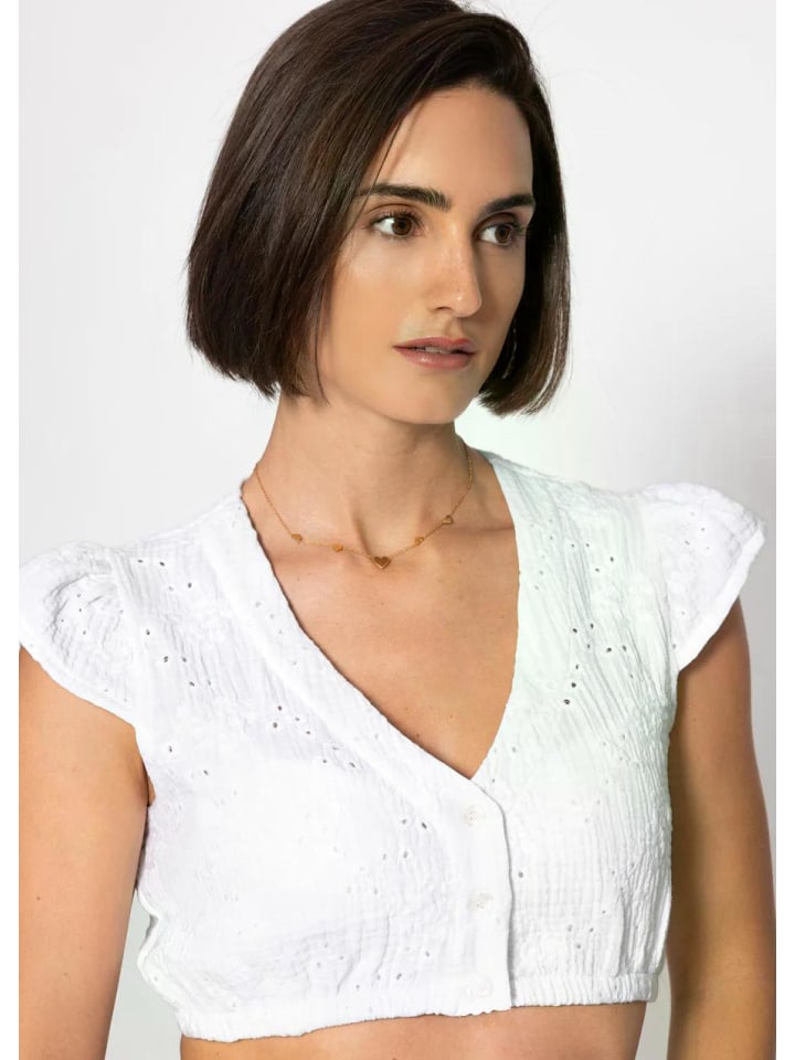 - ДИЗАЙН: Игривая блузка дирндль из легкой муслиновой ткани с изящной вышивкой ажурными петлями, V-образным вырезом и короткими рукавами-крылышками для женственных акцентов.