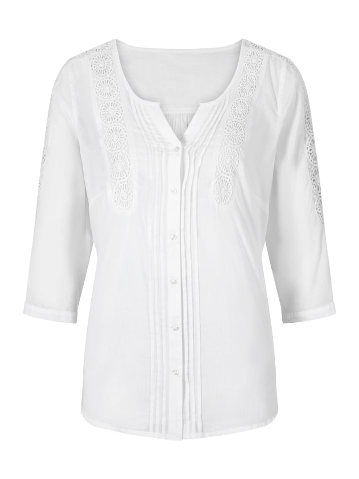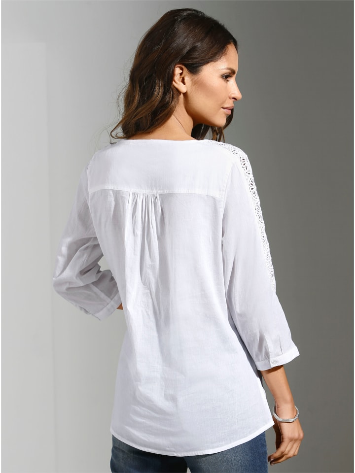 Легкий летний хлопок высокого качества! Блузка приобретает игривый и непринужденный вид благодаря туникообразному крою со складками по обеим сторонам планки с пуговицами и прозрачному кружеву, которое простирается от плеч до рукавов длиной 3/4. Манжеты рукавов застегиваются на узкие пуговицы. Пуговицы в тон. Закругленный низ.