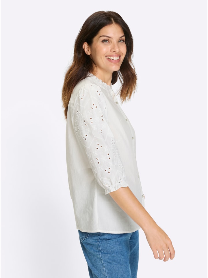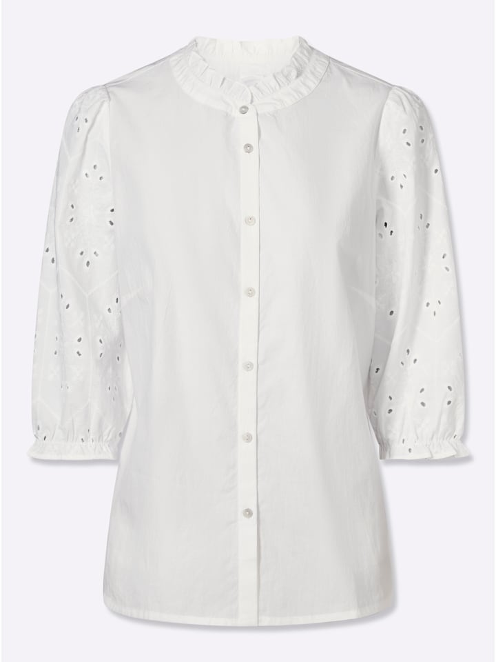 Игривая, очаровательная, очаровательная: блузка с рукавами 3/4 и красивыми деталями. Круглый вырез с пришитой оборкой. Вытачки для придания формы груди и планка с пуговицами по всей длине. Изящные рукава-буфы с вышивкой люверсами и оборками на эластичных манжетах.