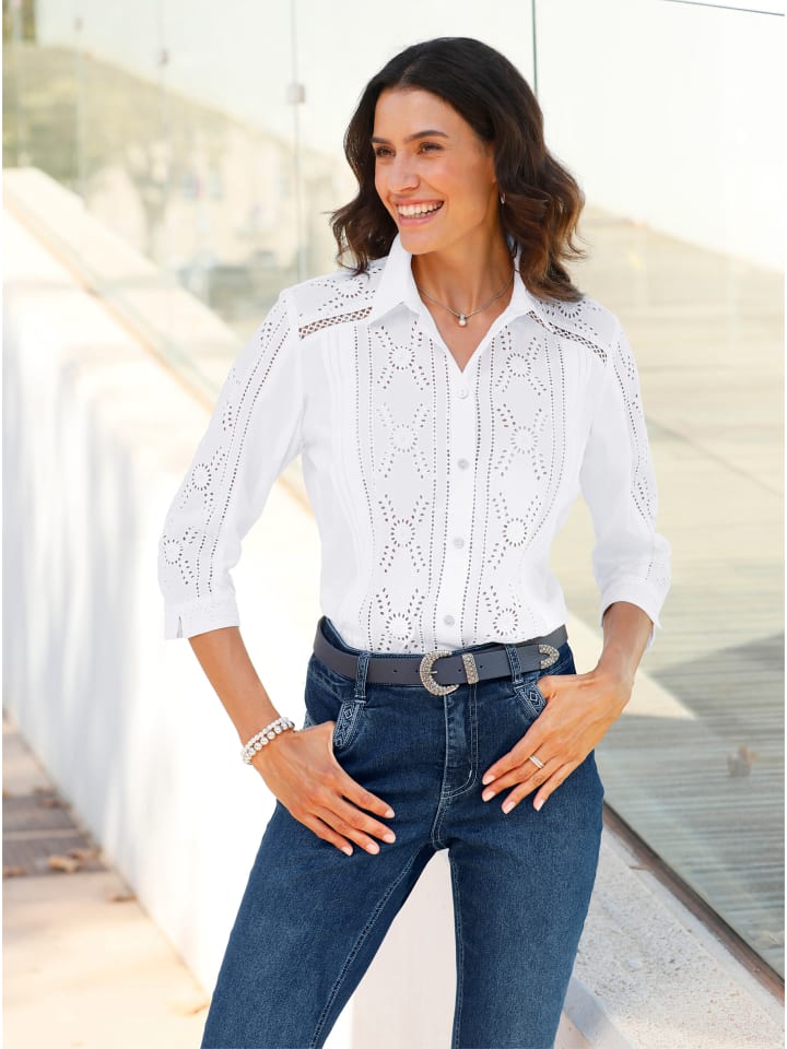 Блузка из хлопка с вышивкой Madeira спереди и сзади на кокетке, нежным кружевом спереди и на рукавах. Отложной воротник и застежка на пуговицы с перламутровым эффектом. Складка сзади. Рукава три четверти с манжетами. В поддержку инициативы «Сделано в Африке» (Cat. Made in Africa).