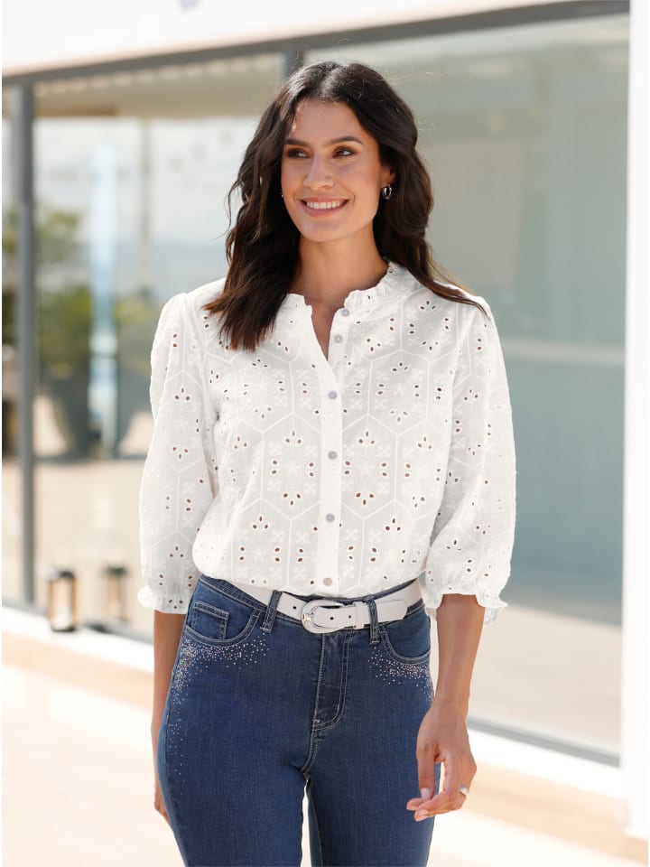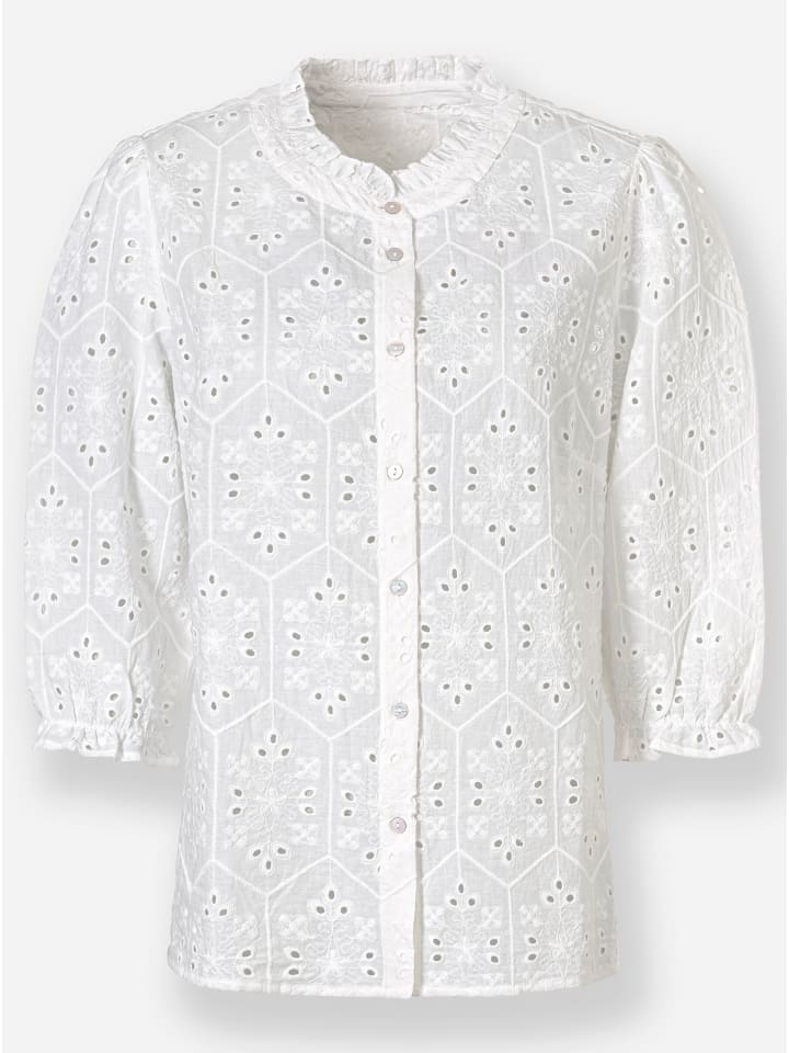Блузка полностью выполнена из высококачественного, слегка прозрачного кружева Мадейра. Круглый вырез украшен оборкой. Застежка на пуговицы с перламутровым эффектом. Небольшая сборка на плечах и кокетке сзади. Вытачки для придания формы груди. Эластичные манжеты на рукавах три четверти создают эффект оборки. В поддержку инициативы «Хлопок, сделанный в Африке».