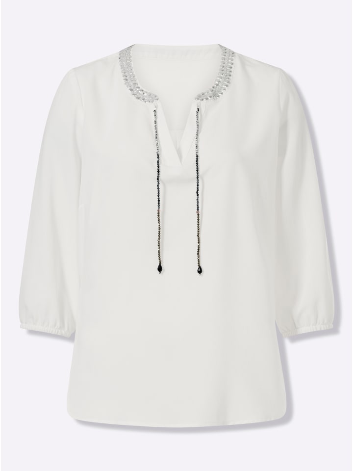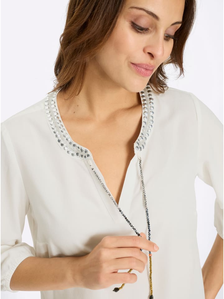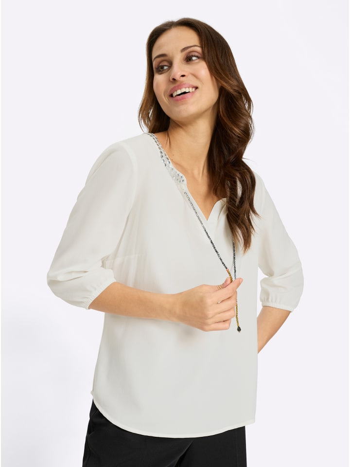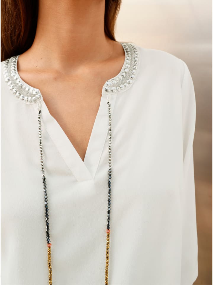 Эта блузка без застежек впечатляет своим великолепным качеством крепа, съемными декоративными цепочками и роскошным декором из декоративных бусин и металлических дисков на комбинированном круглом и V-образном вырезе. Кокетка на спине с последующей складкой обеспечивает свободу движений. Рукава три четверти с эластичными манжетами и формирующими вытачками на груди.
