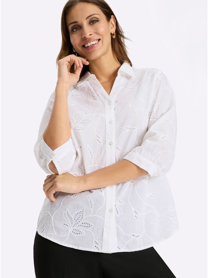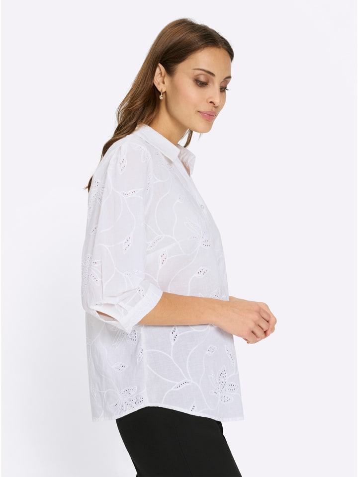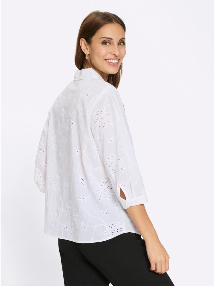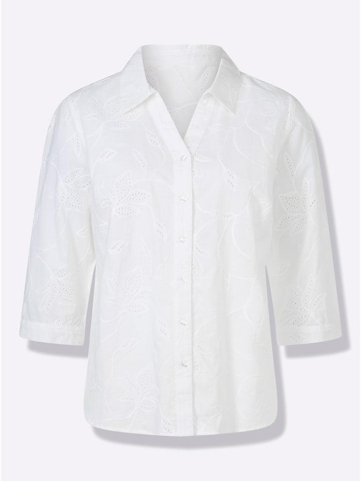 Прекрасно украшенная изысканной вышивкой Madeira: легкая и воздушная хлопковая блузка. Отложной воротник, открытый V-образный вырез, вытачки для придания формы груди и слегка мерцающие пуговицы в тон. Рукава три четверти со складкой на плече и узкие манжеты на пуговицах. Слегка закругленный низ. В поддержку инициативы «Хлопок, сделанный в Африке».