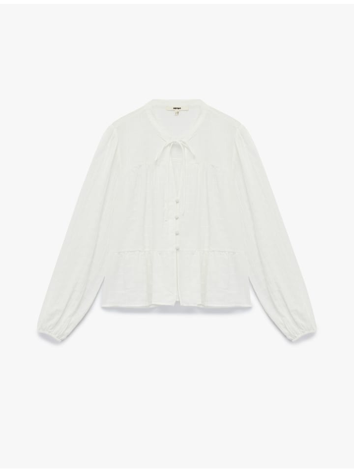 Эта блузка с длинными рукавами добавит воздушной элегантности любому образу. Благодаря рукавам-фонарикам и завязке на круглом вырезе она сочетает в себе стиль и комфорт. Свободный крой и легкая сборка по подолу делают эту блузку универсальным фаворитом.