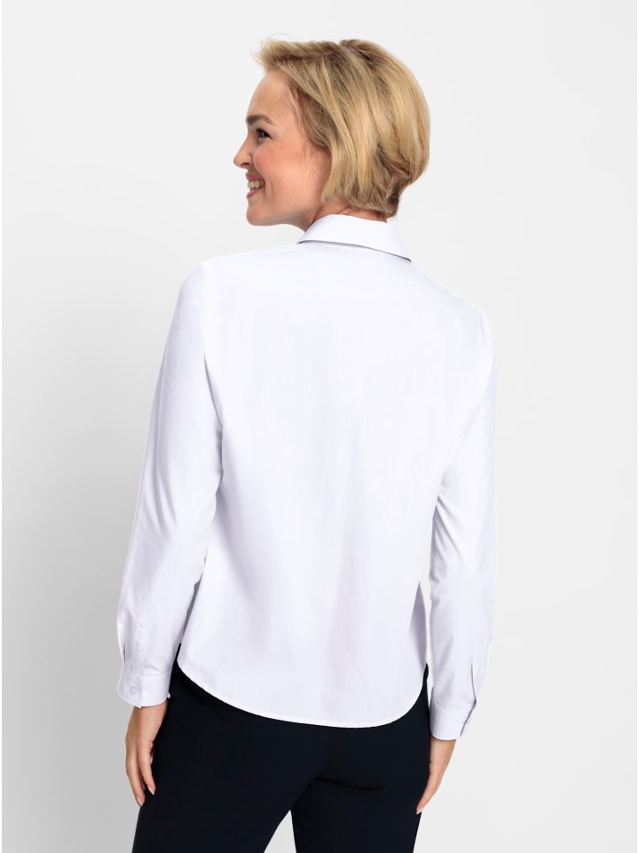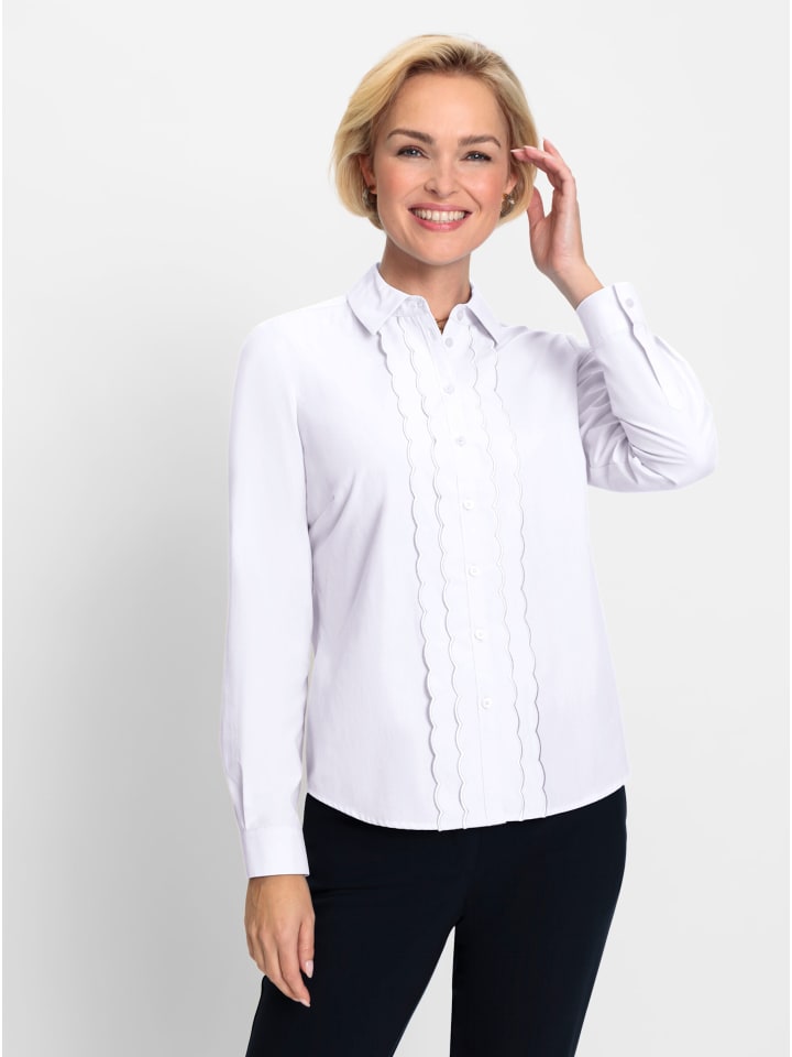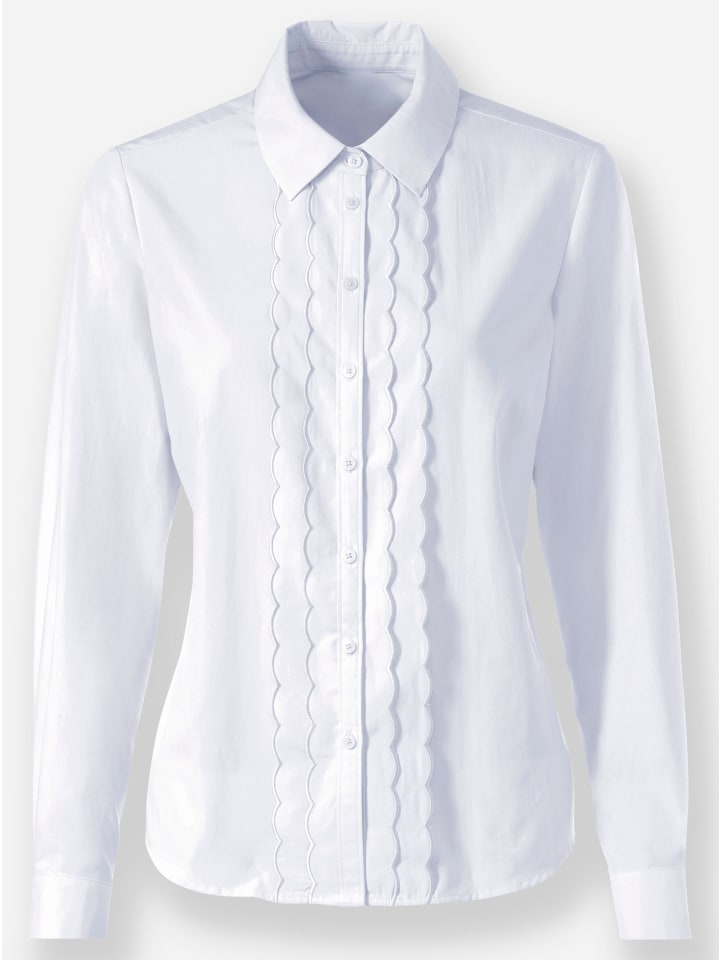 Изящная блузка с четырьмя элегантными фестончатыми панелями вдоль планки с пуговицами. Аккуратный рубашечный воротник и формирующие вытачки на груди. Длинные рукава с манжетами на пуговицах. Слегка закругленный нижний край спереди и сзади.