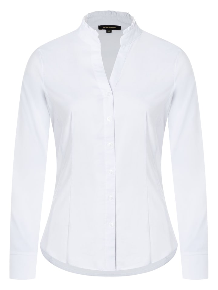 Эта женственная блузка из хлопка/эластичного материала от MORE & MORE с небольшим воротником-стойкой и оборкой одинаково хорошо смотрится под блейзерами, кардиганами и свитерами.