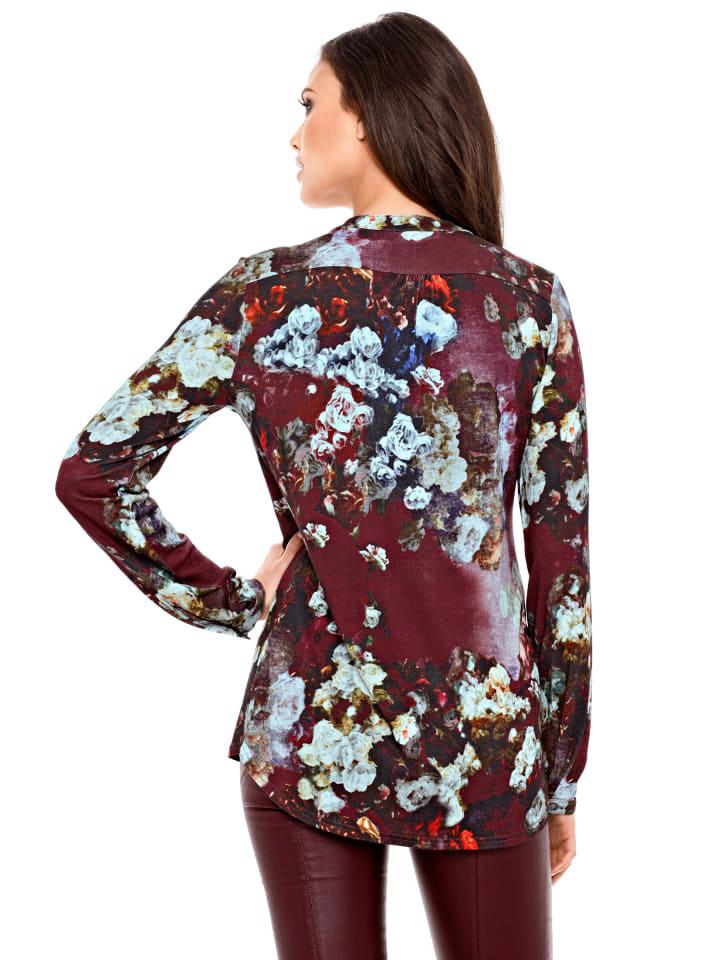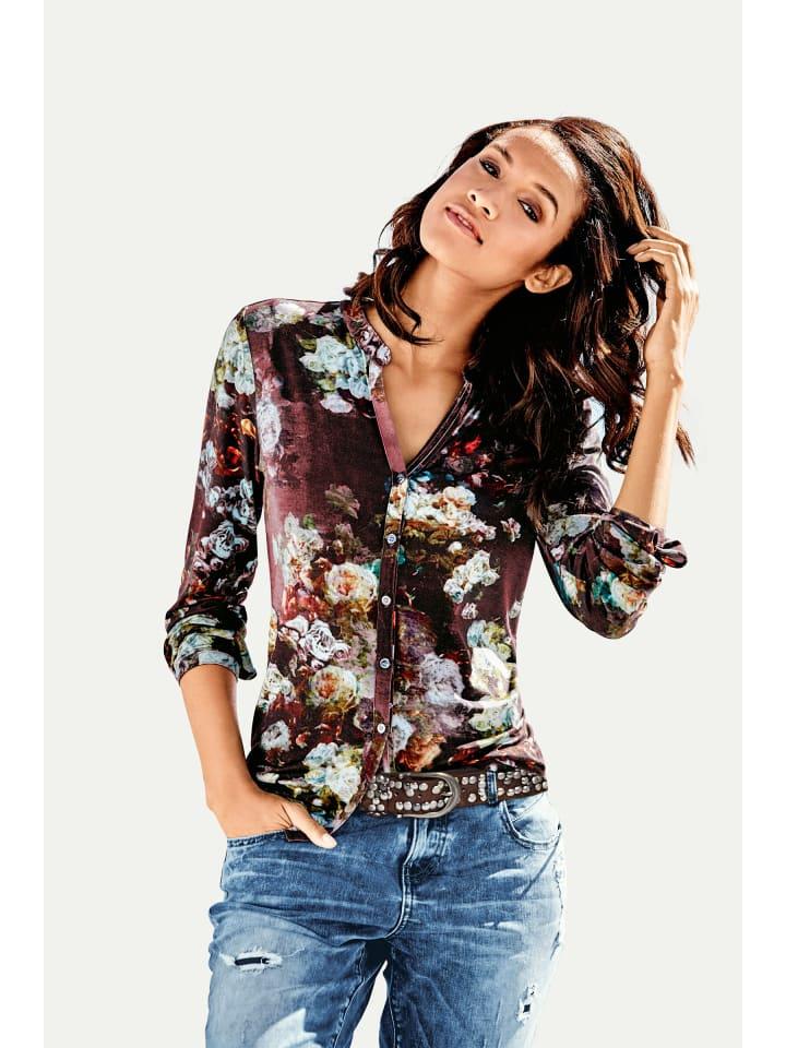 Блузка-рубашка: Эта блузка с привлекательным цветочным рисунком выполнена из мягкого струящегося трикотажа. Прямой крой, подчеркивающий фигуру, дополнен модным воротником-стойкой и планкой на пуговицах. Длинные рукава с манжетами.