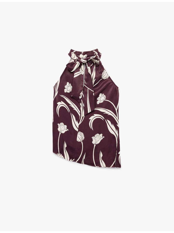 Элегантная атласная блузка с цветочным принтом и стильным халтер-воротом. Мягкая текстура атласа придает ей роскошный вид, делая ее подходящей как для особых случаев, так и для повседневной носки. Декоративные завязки создают яркий и элегантный образ, который подчеркивает современные силуэты и добавляет эстетическую привлекательность любому наряду.
