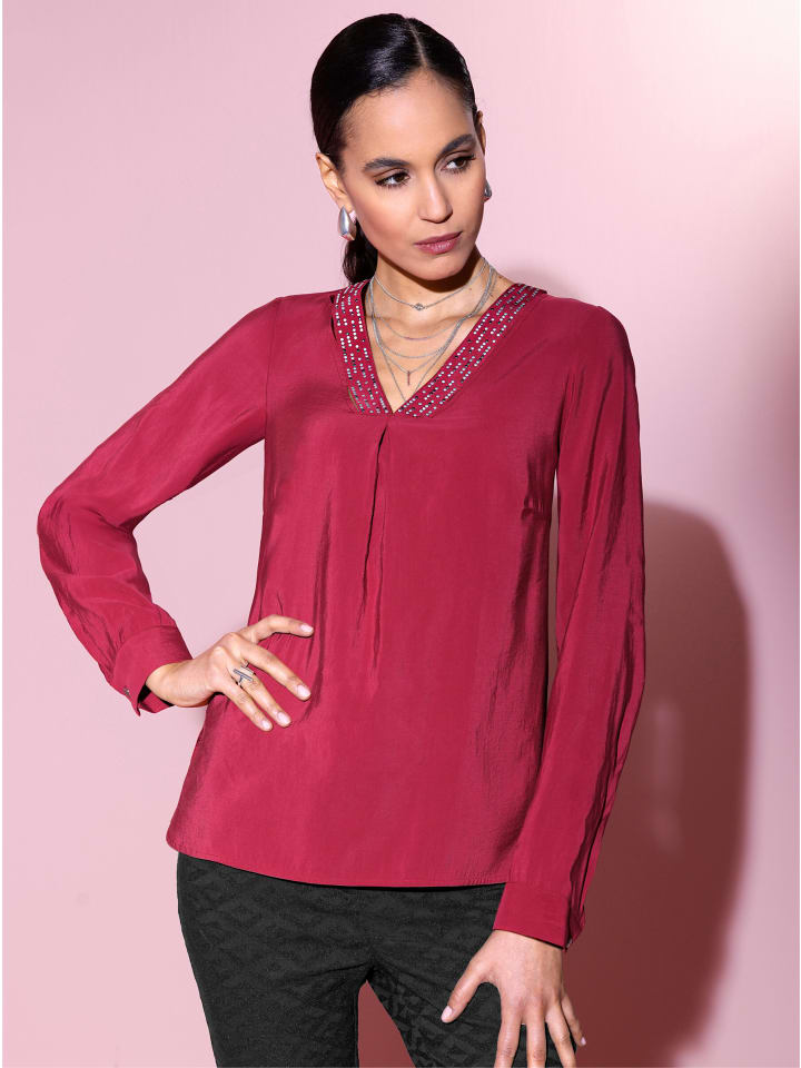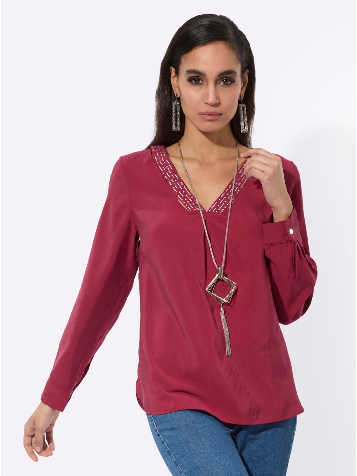 Удлиненный V-образный вырез со сверкающими стразами и изысканными разрезами: просто шикарно! Складка сзади: очень выигрышно смотрится! Блузка из мягкого шелковистого модала с длинными рукавами и манжетами на пуговицах. Слегка закругленный подол. С боковыми разрезами.