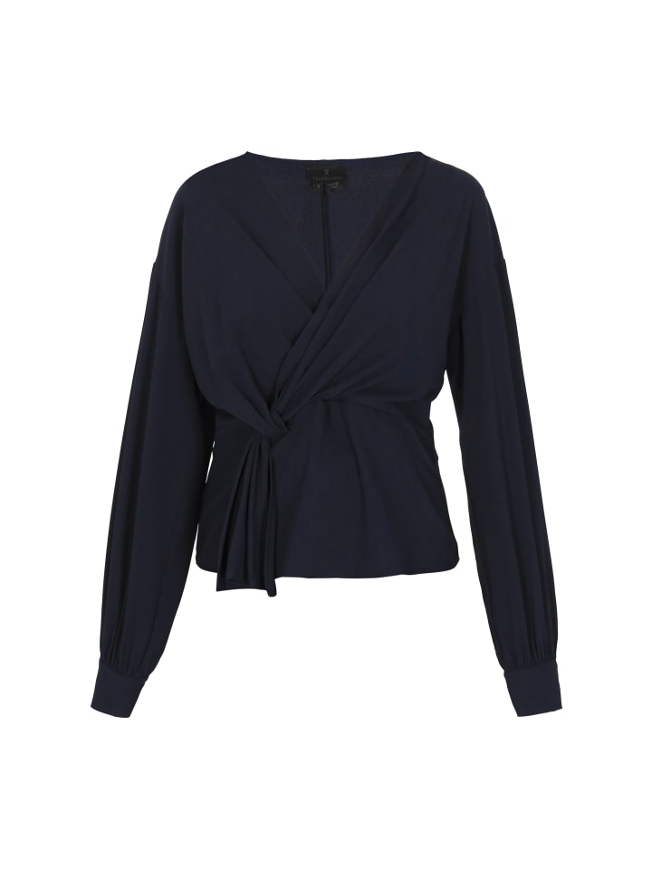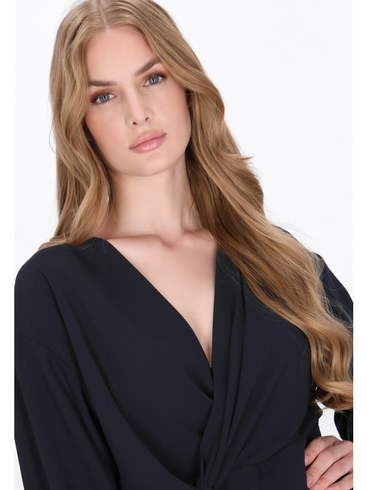 - Блузка свободного кроя с V-образным вырезом и длинными рукавами-бишоп