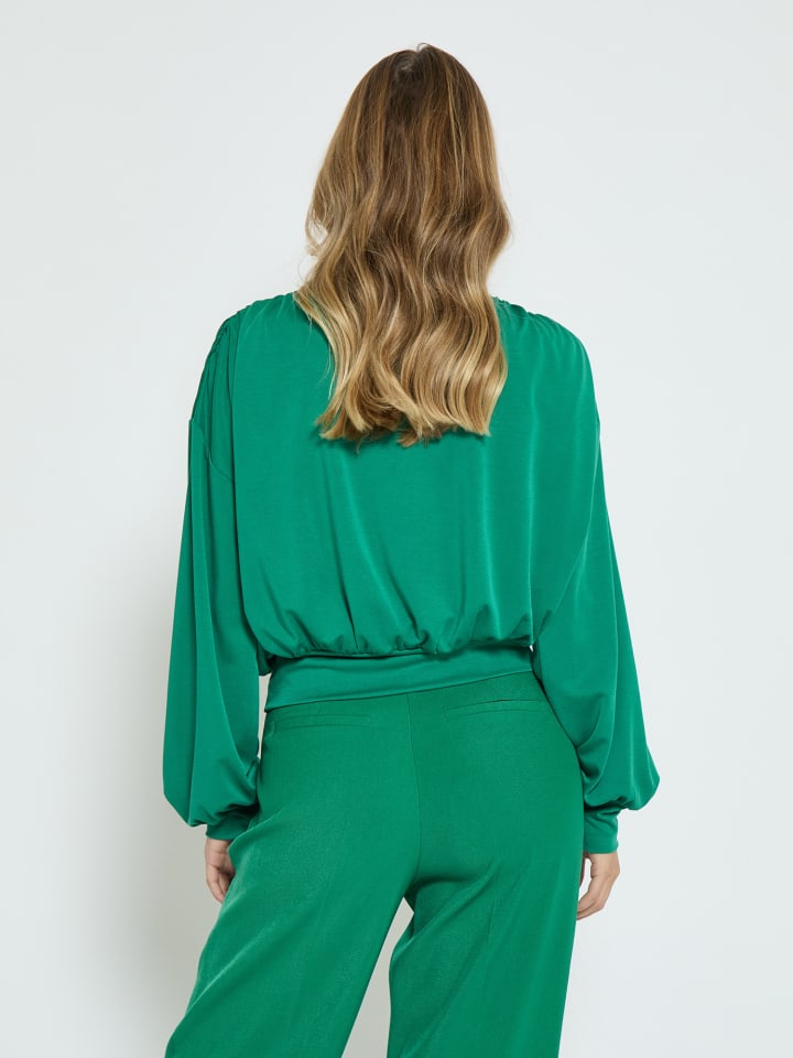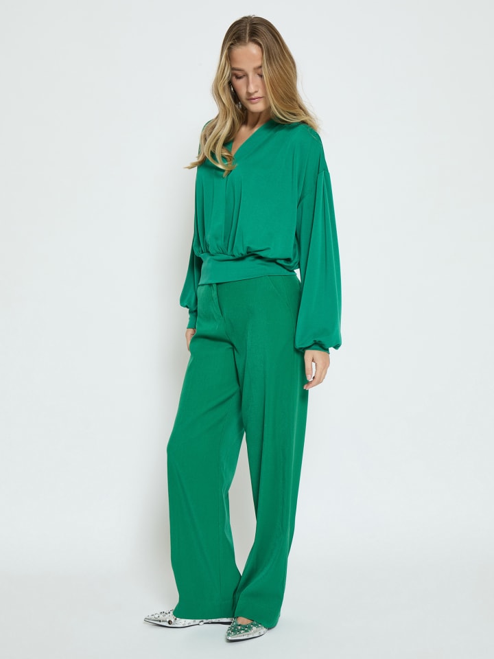 Блузка MSGasia выполнена из смесовой ткани с модалом, что делает ее мягкой и приятной на ощупь. Блузка имеет запах, длинные рукава и V-образный вырез.