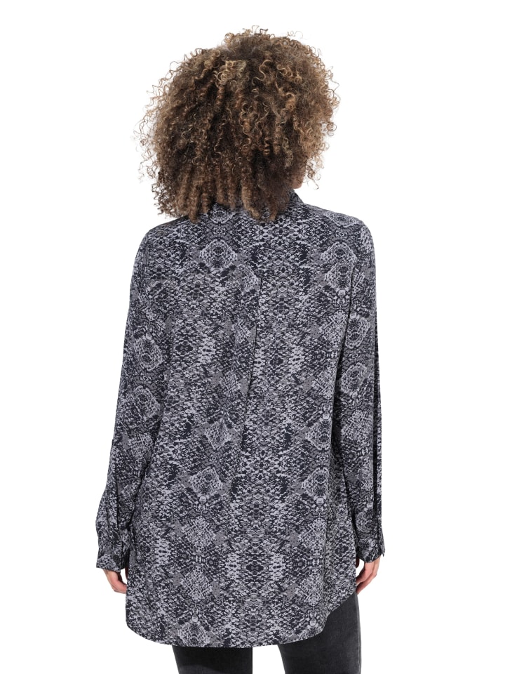 Блузка-рубашка А-силуэта из мягкой вискозы с принтом под змею. Отложной воротник, длинные рукава с манжетами. Закругленный низ с боковыми разрезами для дополнительного комфорта.