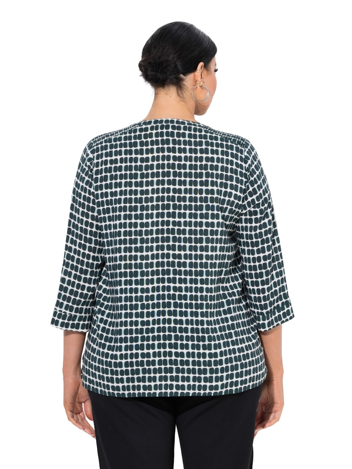 Блузка классического кроя из мерцающего атласа с рисунком. Эластичные присборенные плечи. Туникообразный вырез, рукава 3/4 с разрезами. Боковые разрезы для дополнительного комфорта.