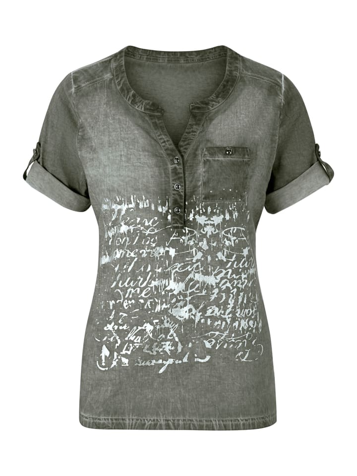 Эта рубашка, выполненная в модном цвете «oil-dyed» с чуть более светлыми швами, отличается множеством модных деталей: передняя часть выполнена из мягкой блузочной ткани с серебристым мерцающим принтом, декоративными металлическими стразами и нагрудным карманом на пуговицах. Свободный крой, спинка немного удлиненная. Круглый вырез горловины с небольшим V-образным вырезом и планкой на пуговицах. Подкатные рукава застегиваются на хлястик и пуговицу. Спинка и рукава выполнены из трикотажной ткани.