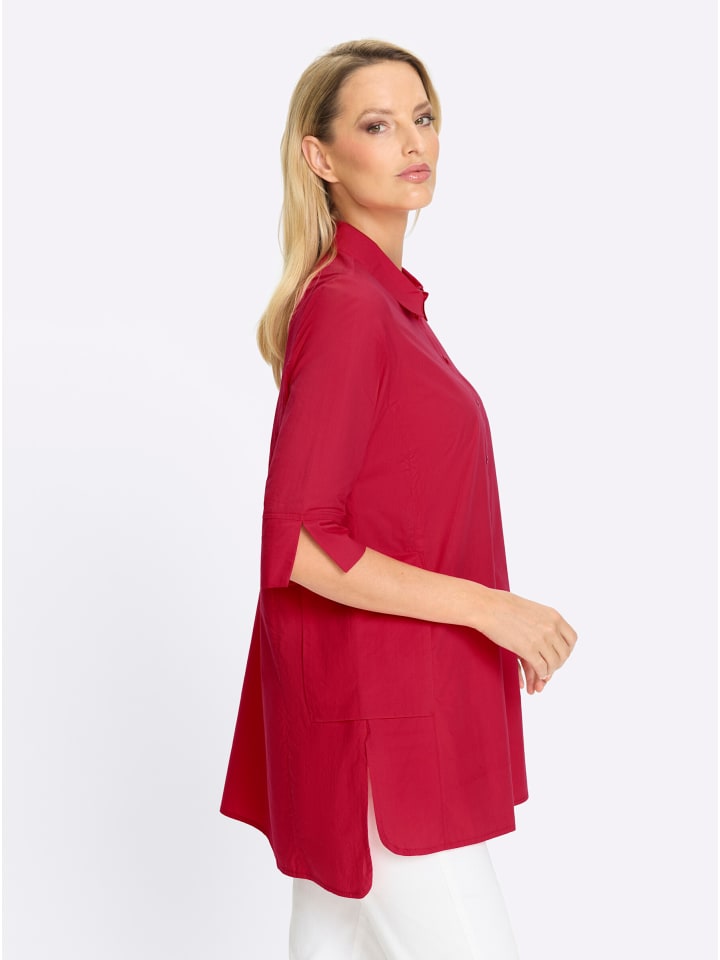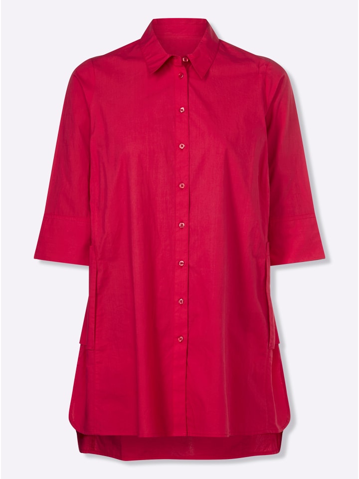 Длинная блузка: Современный стиль комбинирования с рубашечным воротником, застежкой на пуговицы по всей длине и рукавами три четверти с разрезами. Большие накладные карманы по бокам. Закругленный низ с боковыми разрезами. Поддерживает инициативу «Сделано в Африке» (Cat Made in Africa). Изготовлено из переработанного полиэстера.