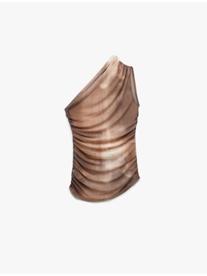Эта современная блузка отличается уникальным дизайном на одно плечо и элегантным облегающим кроем. Драпированные детали и плавный крой придают верху изысканный вид. Эта блузка без рукавов идеально подходит для теплых дней, обеспечивает легкий и стильный вид и добавит свежую нотку в ваш гардероб.