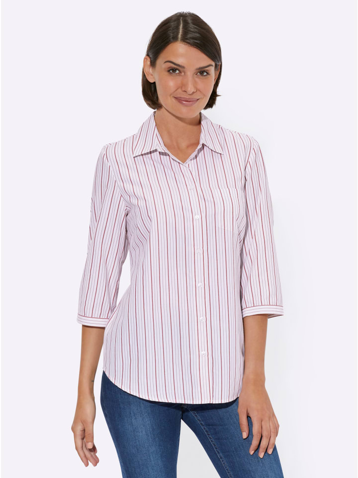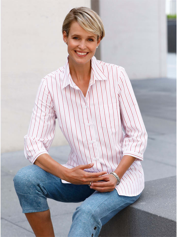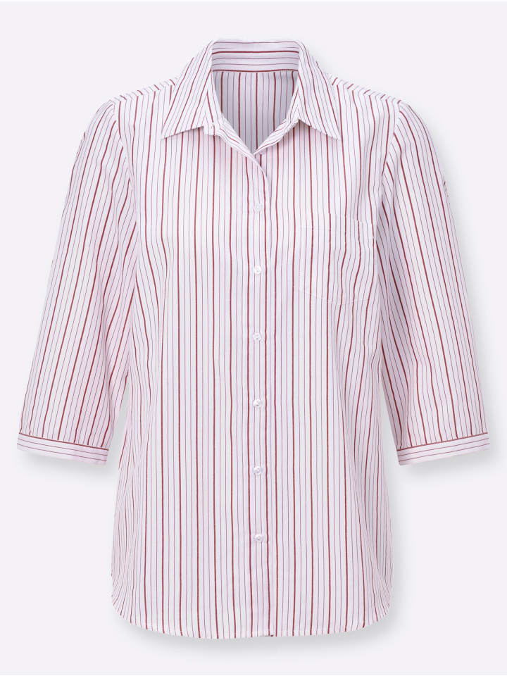 Эта мягкая блузка из хлопковой смеси отличается эффектным полосатым дизайном. Она имеет рубашечный воротник, планку на пуговицах, практичный накладной нагрудный карман и рукава три четверти с манжетами на пуговицах в горизонтальную полоску. Низ слегка закруглен спереди. Вытачки на груди обеспечивают удобную посадку.