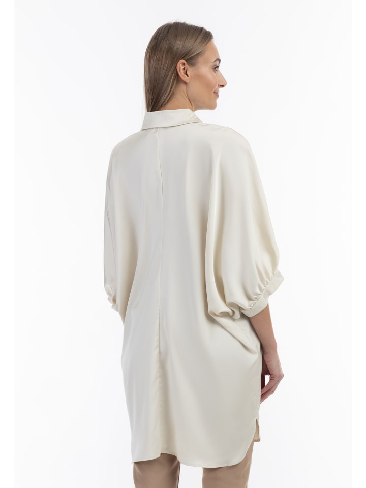 Шелковистый блеск и модный свободный силуэт придают этой длинной блузке от RISA неповторимый стиль. Помимо планки с пуговицами и воротника-стойки, именно рукава создают образ пончо. Сочетайте ее с облегающими брюками, джинсами или леггинсами для создания непринужденного летнего образа.