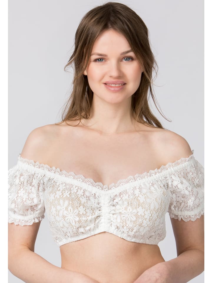 Блузка Katya дирндль от Stockerpoint кремового цвета. Эта изысканная женская блузка из прозрачного кружева прекрасно подходит для образа Кармен и впечатляет своей превосходной посадкой. Она украшена нежным кружевом и прекрасно подчеркивает декольте. Кулиска спереди позволяет регулировать вырез, обеспечивая идеальную посадку по фигуре. Небольшие кружевные детали на манжетах добавляют дополнительный штрих и идеально дополняют образ.