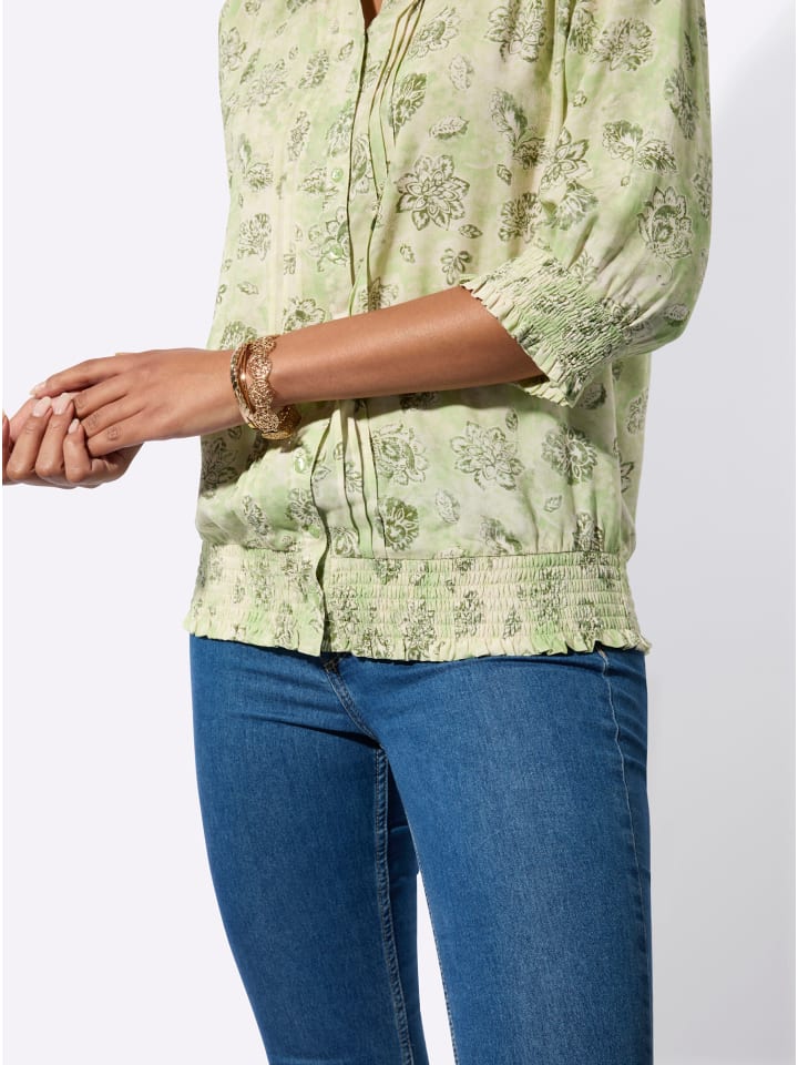 Современная блузка с цветочным принтом и множеством изысканных деталей. Круглый вырез горловины с отделкой и трехрядными защипами вдоль планки с пуговицами по всей длине. Сборка на скошенной кокетке. Присборенные манжеты на рукавах три четверти и подоле. Приталенный силуэт с двойной кокеткой и драпировкой сзади. Приятная струящаяся вискоза качества ECOVERO от Lenzing.