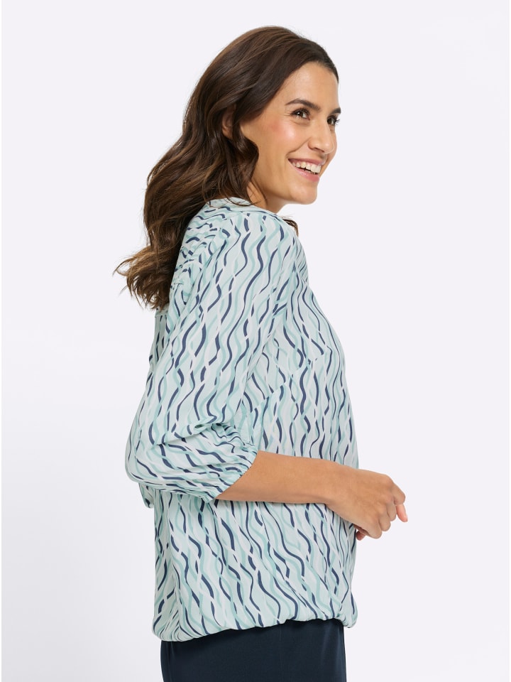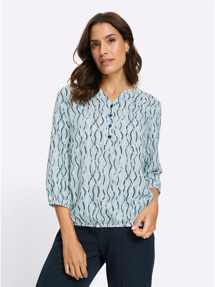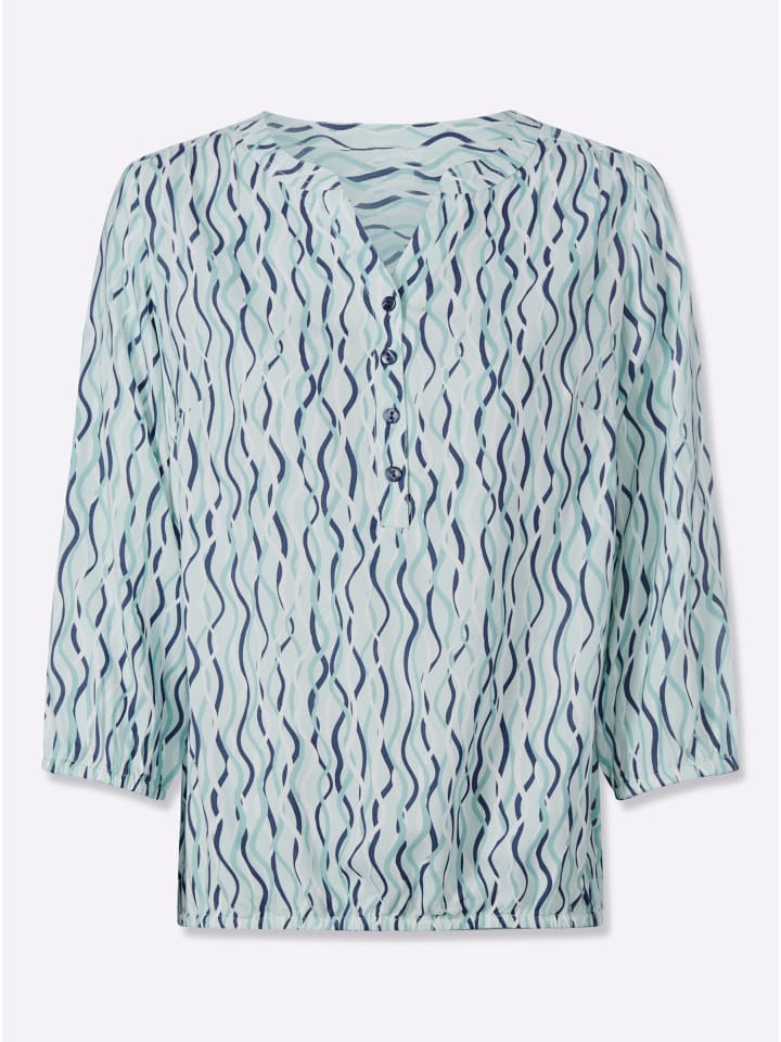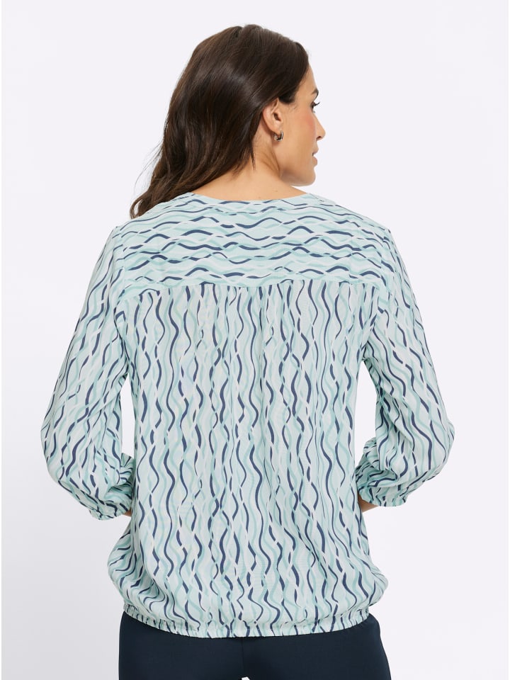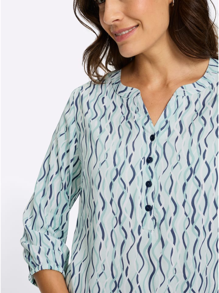 Модный волнистый рисунок этой блузки с принтом визуально удлиняет фигуру. Сборки на кокетке спереди и сзади обеспечивают комфортную посадку, а эластичные манжеты на рукавах и подоле создают красивую драпировку - изделие, подчеркивающее фигуру. Комбинированный круглый вырез с V-образным вырезом, короткая планка на пуговицах, корректирующие вытачки на груди и рукава три четверти. Изготовлена из струящейся вискозы качества ECOVERO от Lenzing.