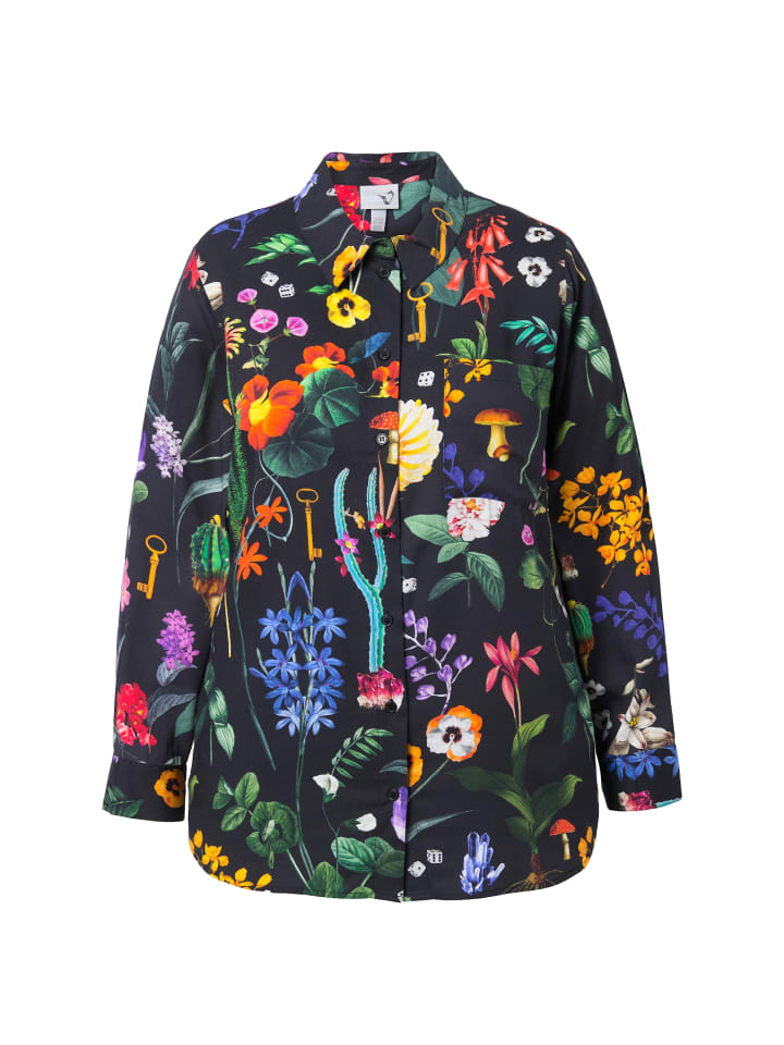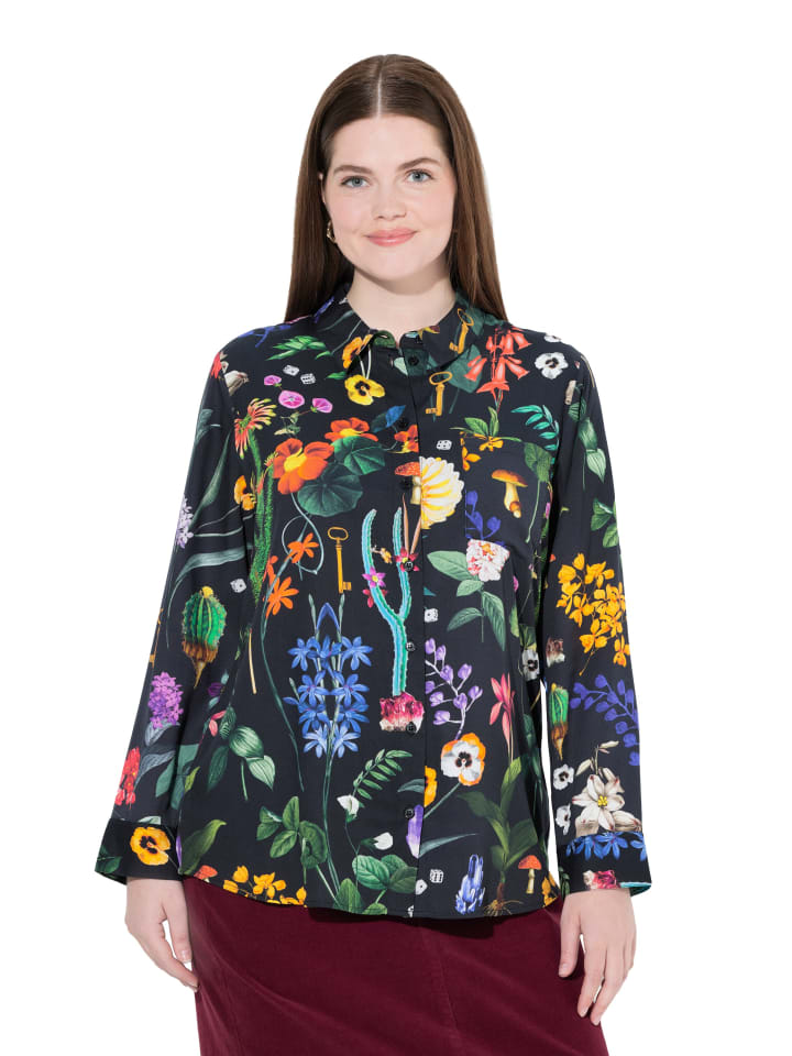 Блузка-рубашка, прямого кроя, из мягкой вискозы со стильным узором в деревенском стиле. Отложной воротник, нагрудный карман, закругленный низ. Длинные рукава с манжетами.