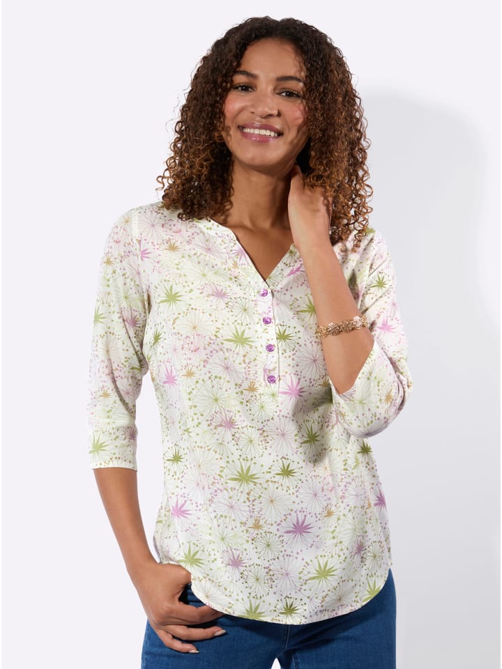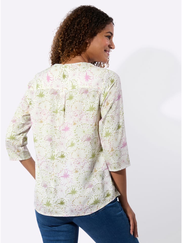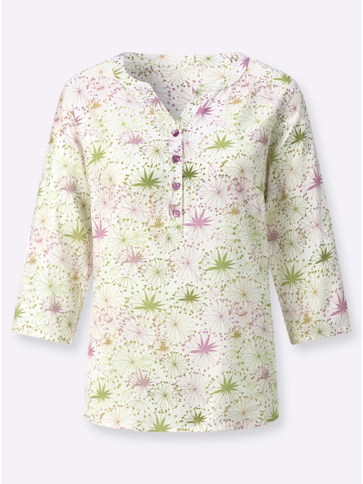 Удобный и универсальный повседневный спутник: уютная блузка без застежек с цветочным принтом по всей поверхности. Круглый вырез с открытым V-образным вырезом и короткой планкой на пуговицах. Рукава три четверти, слегка скругленный низ. Вискоза качества ECOVERO от Lenzing.
