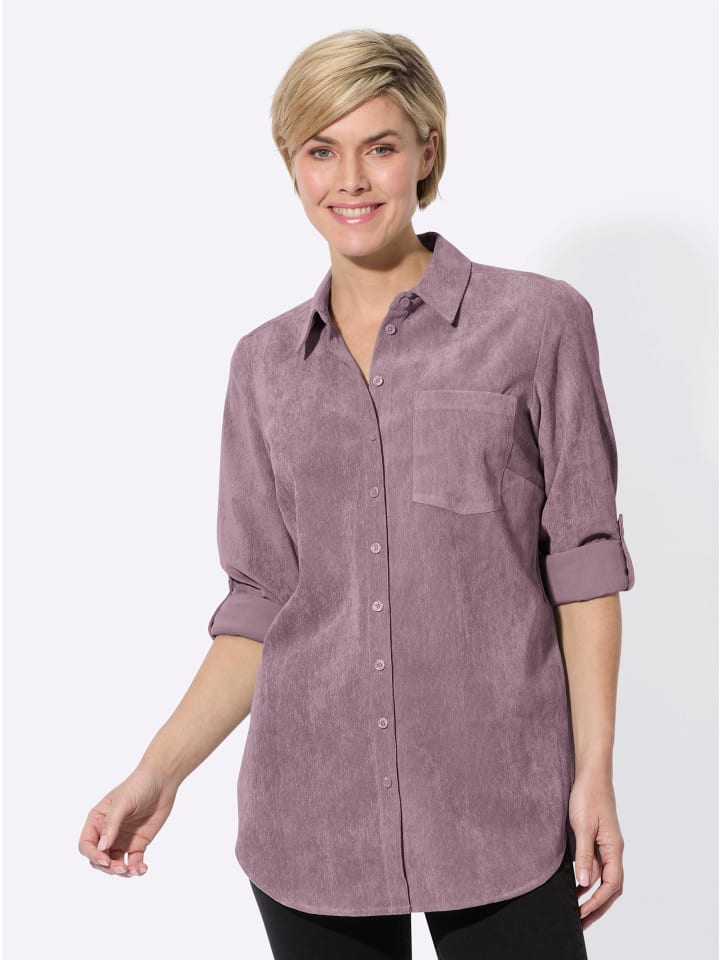Современная, универсальная длинная блузка из удивительно мягкого переливающегося детского вельвета. Отложной воротник, застежка на пуговицы по всей длине и декоративный нагрудный карман. Длинные рукава с манжетами можно подвернуть и закрепить на хлястике и пуговице. Два кармана в швах и закругленный подол.