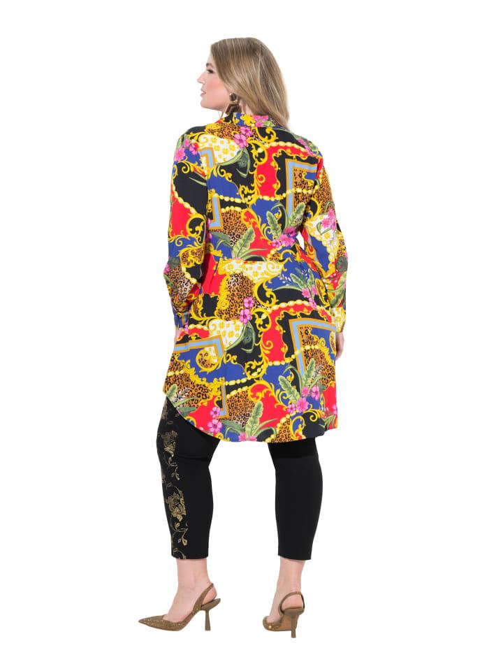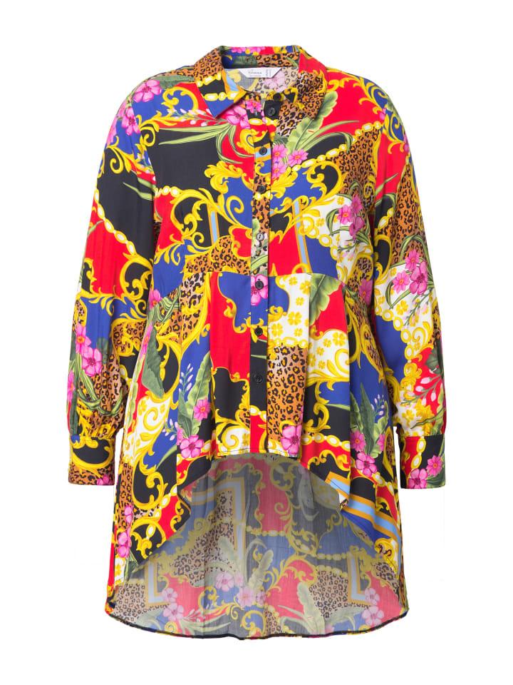 Блузка А-силуэта из мягкой струящейся вискозы с принтом по всей поверхности и декоративными складками по центральному шву. Отложной воротник, планка на пуговицах, длинные рукава с манжетами. Широкий подол.