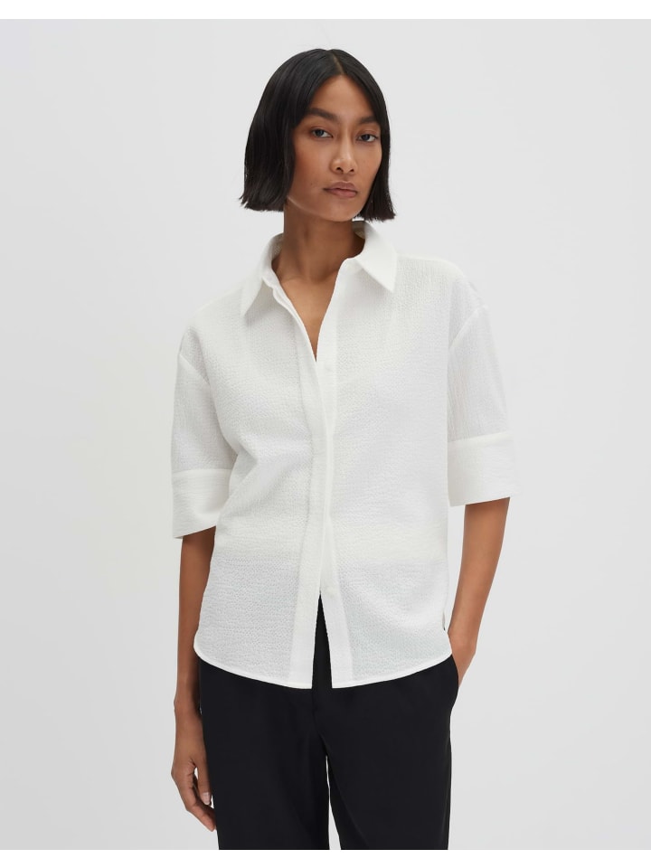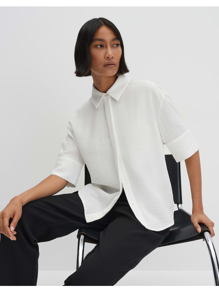 Свободный крой, свободный крой, спущенная линия плеча с короткими рукавами, рубашечный воротник, длина по спинке около 62 см для размера 36, рост модели 176 см - на ней размер 36, ткань, фактура сирсакера, плотная на ощупь, сохраняет форму, закругленный низ, потайная планка с пуговицами, классические манжеты