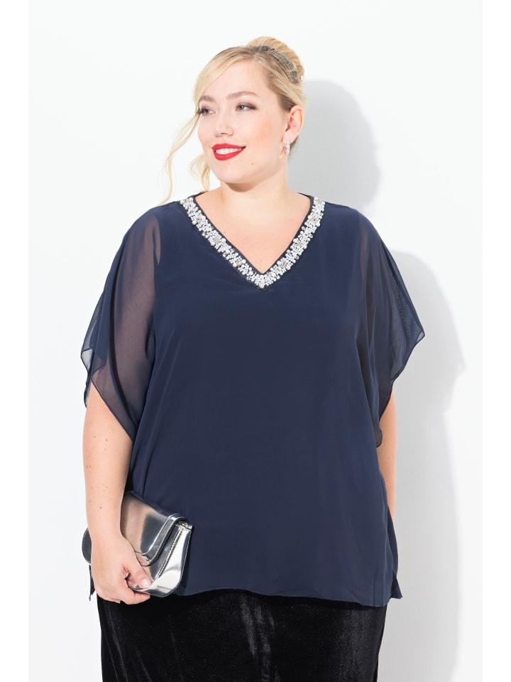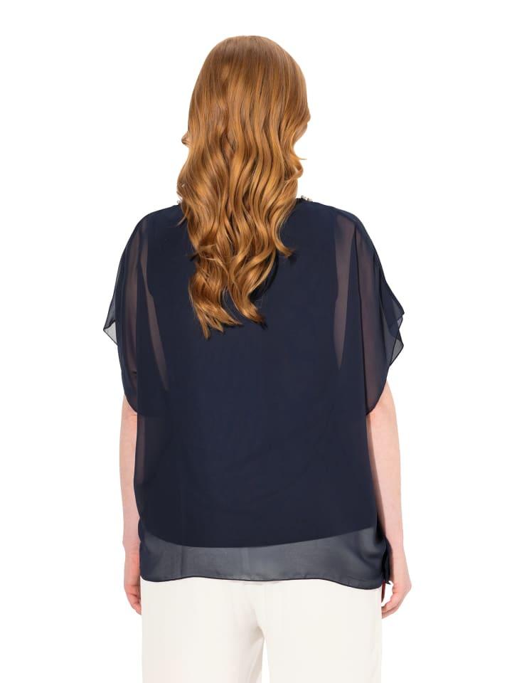 Блузка из двухслойного шифона свободного кроя. Прозрачная шифоновая накидка с элегантными декоративными бусинами на V-образном вырезе. Широкие, спущенные плечи. Асимметричный подол - закругленный слева. Верх из плотного трикотажа.