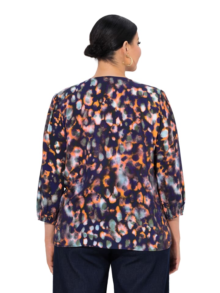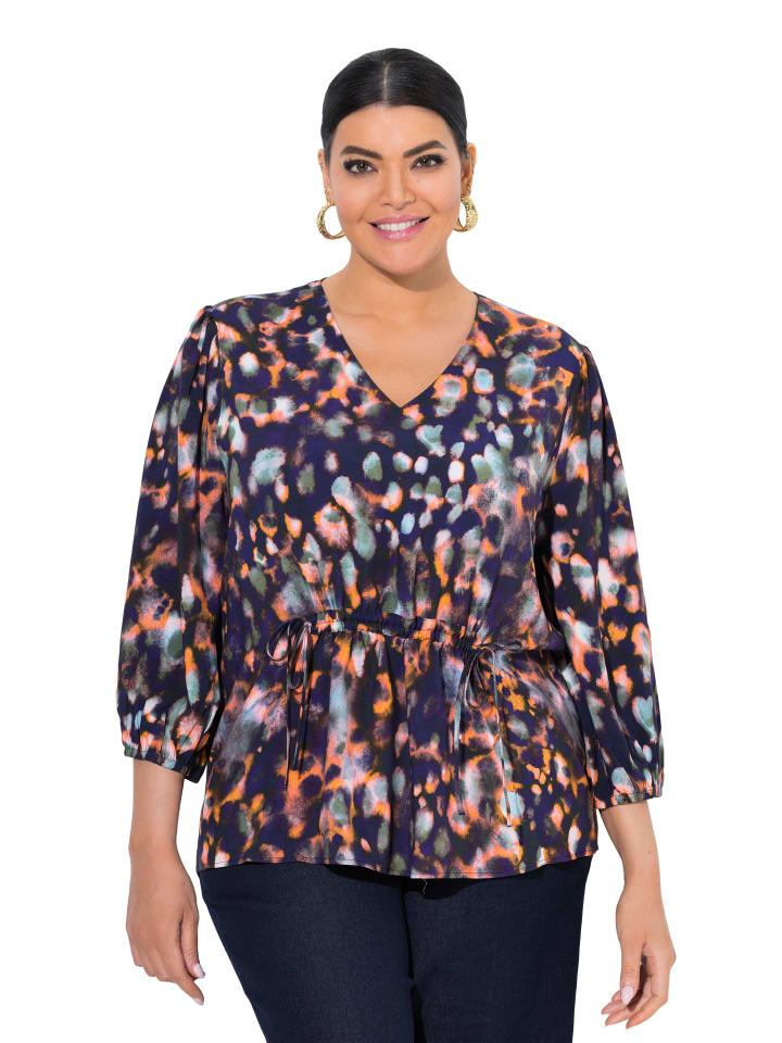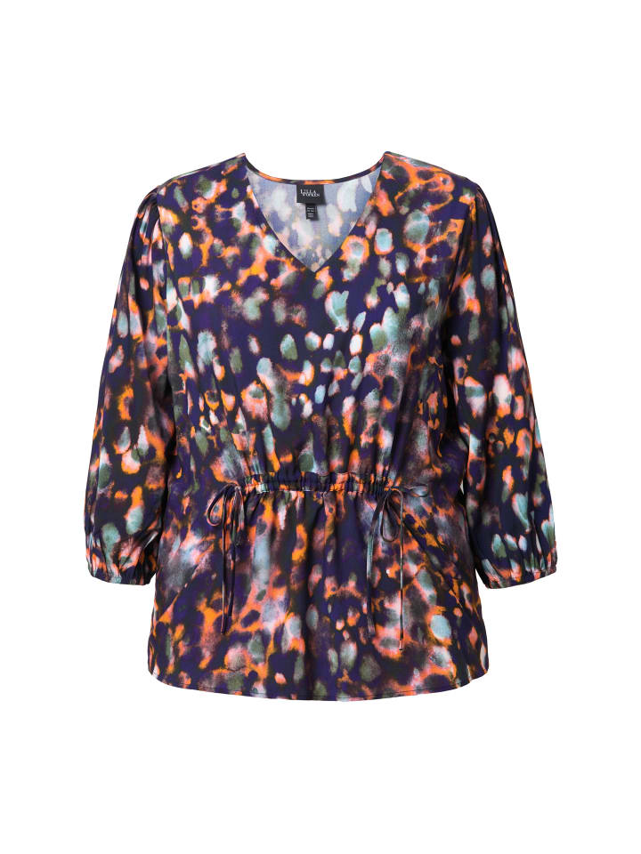 Блузка классического кроя из мягкой хлопковой ткани с современным рисунком. V-образный вырез, кулиска на талии спереди - всегда ваш желаемый силуэт. Широкие рукава 3/4 с эластичными манжетами.