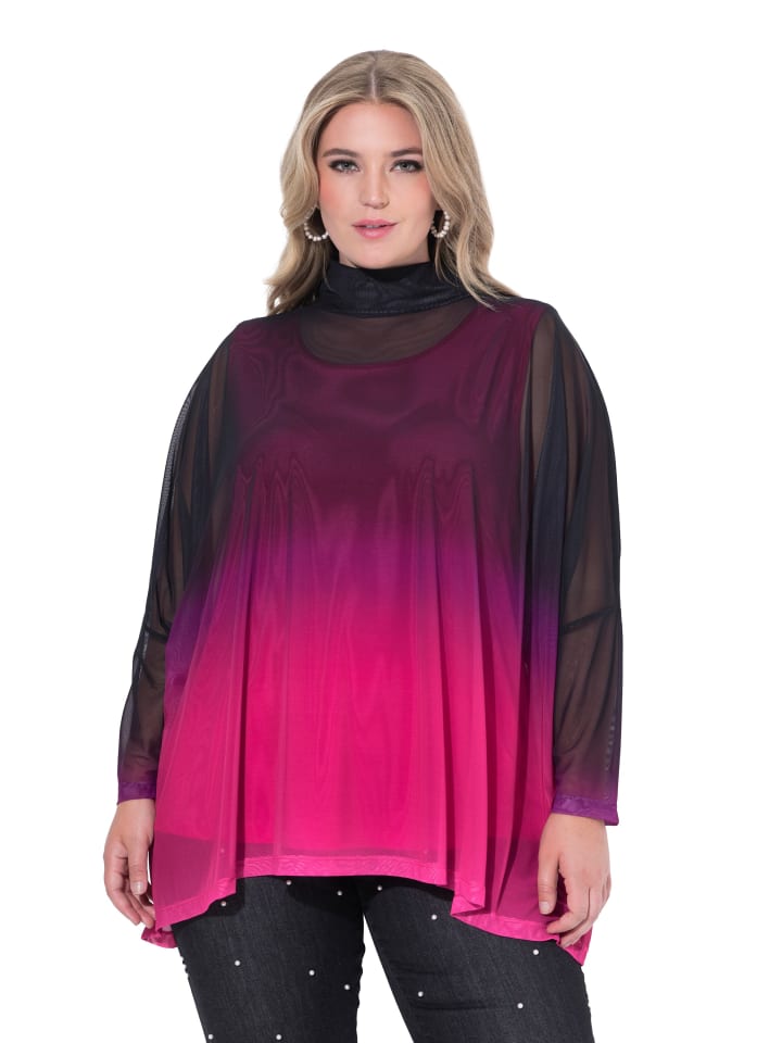 Сетчатая блузка из прозрачной градиентной сетки. Верх из плотного трикотажа. Небольшой воротник-стойка, широко спущенные плечи, короткие рукава.
