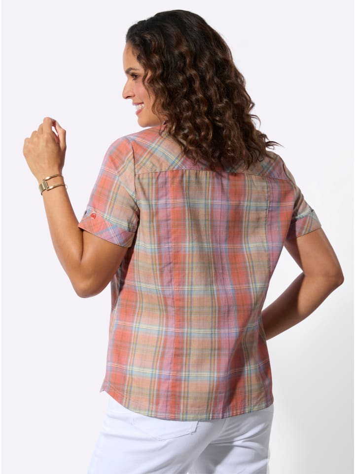 Универсальная, высококачественная, окрашенная в пряже, современная: клетчатая блузка из хлопка, не требующего особого ухода. Имеет открытый воротник, застежку на пуговицы по всей длине, короткие рукава с фиксированными отворотами и закругленный подол. Два асимметричных накладных нагрудных кармана украшены пуговицами. Передние и задние швы создают привлекательный силуэт. Поддерживает инициативу «Хлопок, сделанный в Африке».