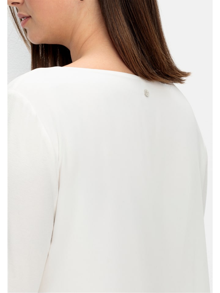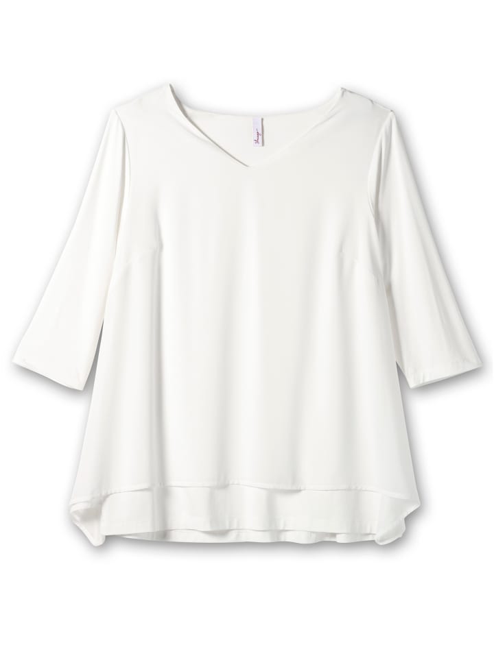 Блузка-рубашка с V-образным вырезом. Двухслойный вид делает этот топ с заостренным подолом таким особенным. В то время как верхний слой выполнен из нежного, слегка прозрачного шифона, нижний слой и удлиненные полурукава поражают своим комфортным качеством эластичного трикотажа. Этот фасон не только идеально дополнит модные деловые наряды - легкость шифона также придает блузке-рубашке элегантный вид и делает ее подходящей для праздничных случаев.