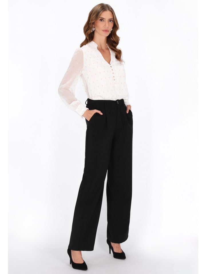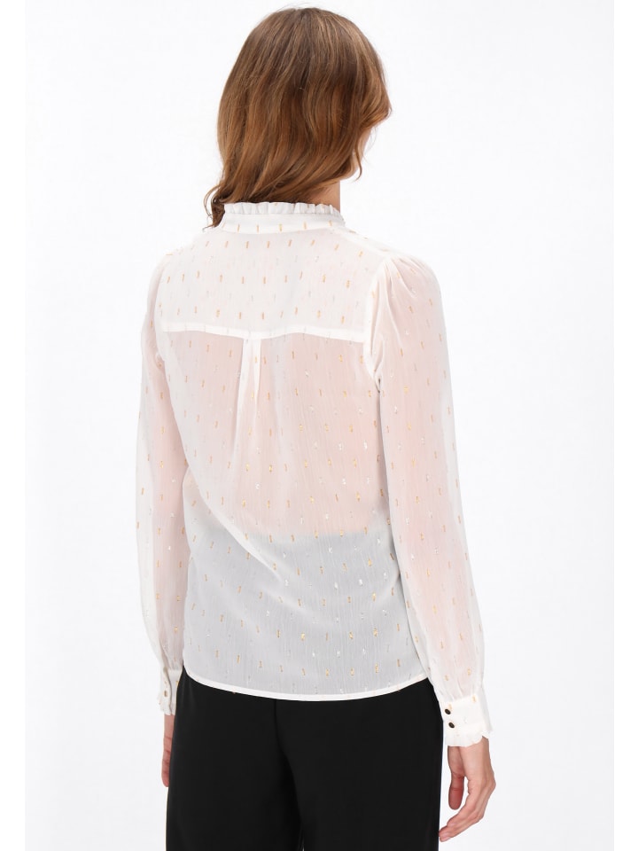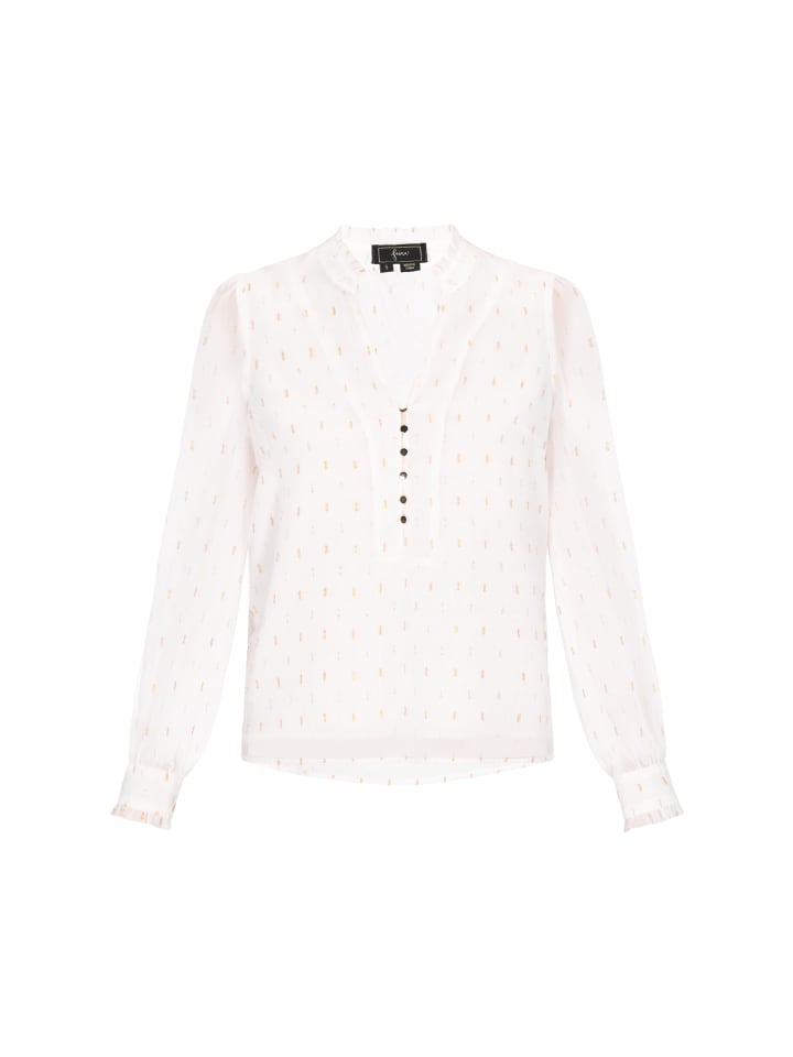 Эта блузка прямого кроя с V-образным вырезом и оборчатым воротником излучает женственное очарование и неподвластный времени стиль. Изготовлена из легкого шифона с нежным узором в горошек и украшена декоративными пуговицами. Длинные рукава-фонарики добавляют романтики, а воздушная ткань обеспечивает комфорт. Идеально подходит для повседневных, но элегантных образов с классическими нотками. Эта блузка входит в коллекцию Fashion Look.