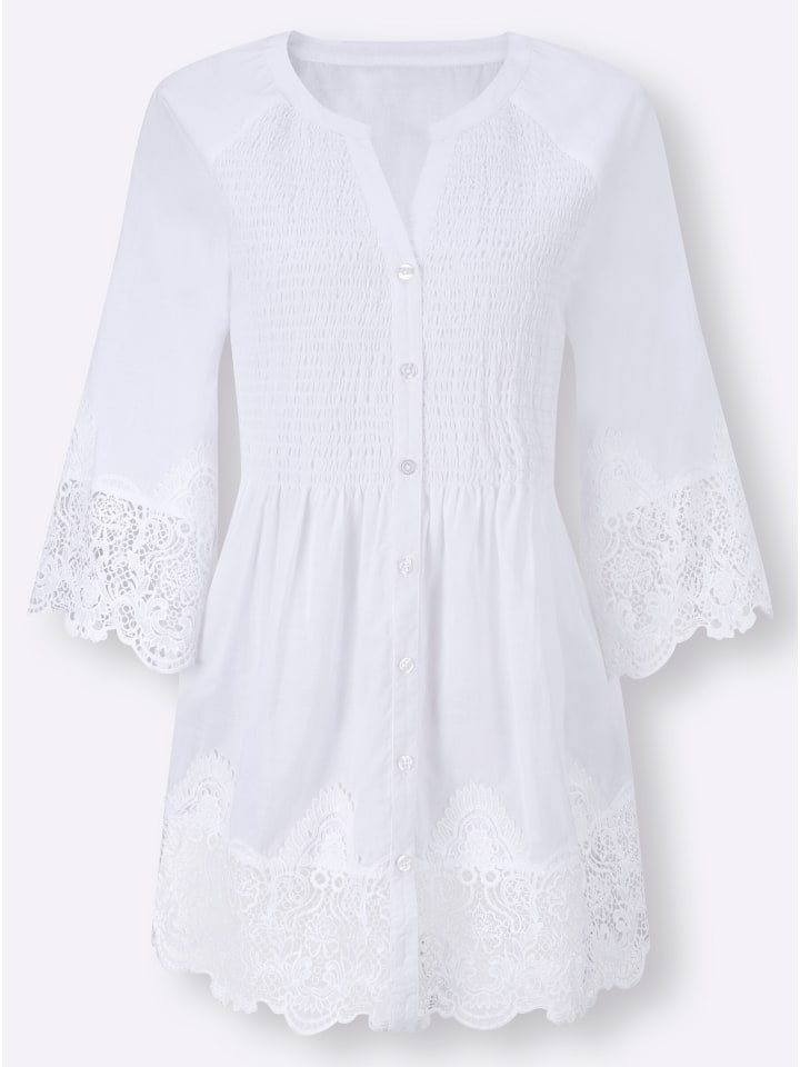 Нежная кружевная отделка по подолу спереди и краям слегка расклешенных рукавов реглан - настоящая изюминка этой блузки! Круглый вырез с небольшим V-образным вырезом и застежка на пуговицы по всей длине. Под сборками спереди тонкие складки создают грациозную драпировку.