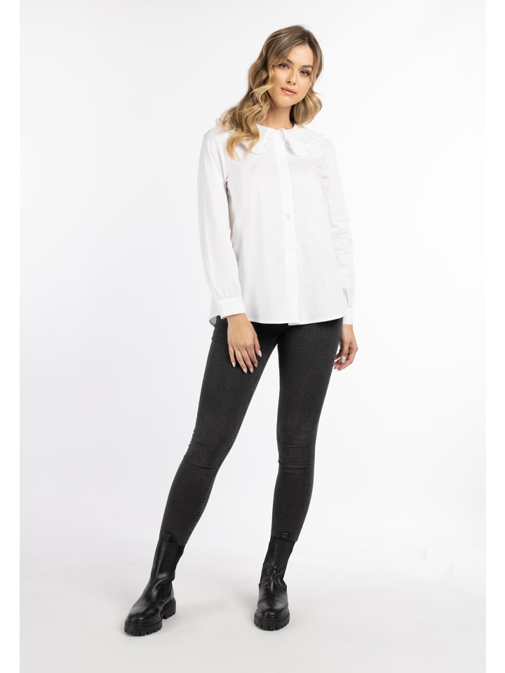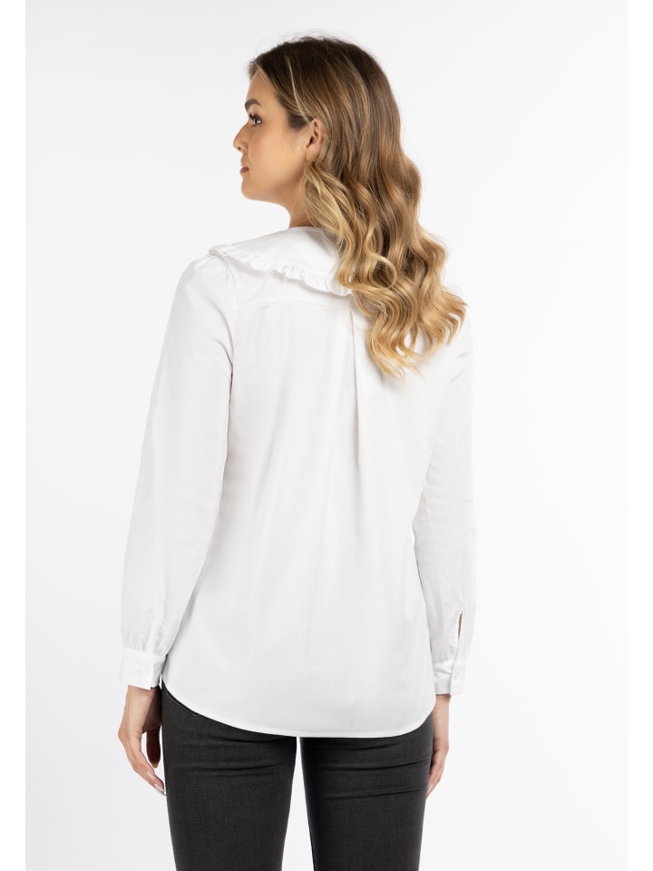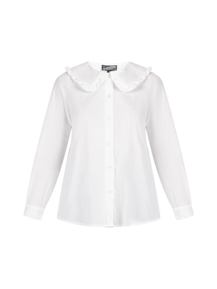 Эта блузка с длинными рукавами от DreiMaster Vintage выполнена из легкого хлопка и дополнена игривым воротником «Питер Пэн» и оборками. Длинные рукава заканчиваются манжетами на пуговицах.