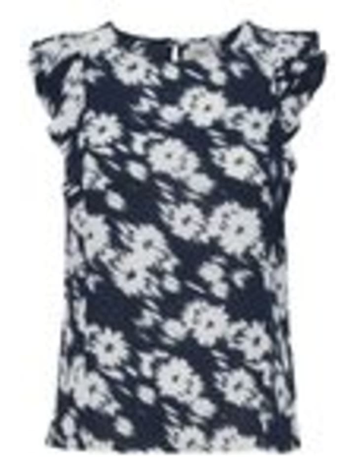 Полосатый топ без рукавов прямого кроя, мягкая текстура, круглый вырез горловины и изящная оборка на плечах.