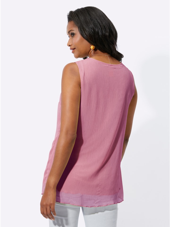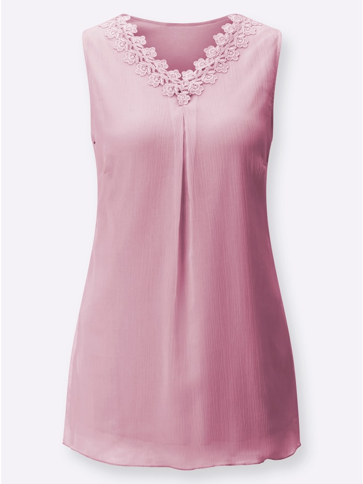 Легкая и эффектная летняя вещь! Эта блузка-топ свободного, удлиненного силуэта. Складка спереди обеспечивает комфортную свободу движений. V-образный вырез отделан кружевом и небольшой складкой. Низ отделан стежкой «бэбилок». Изготовлено из переработанного полиэстера. Подкладка из вискозы ECOVERO от Lenzing.