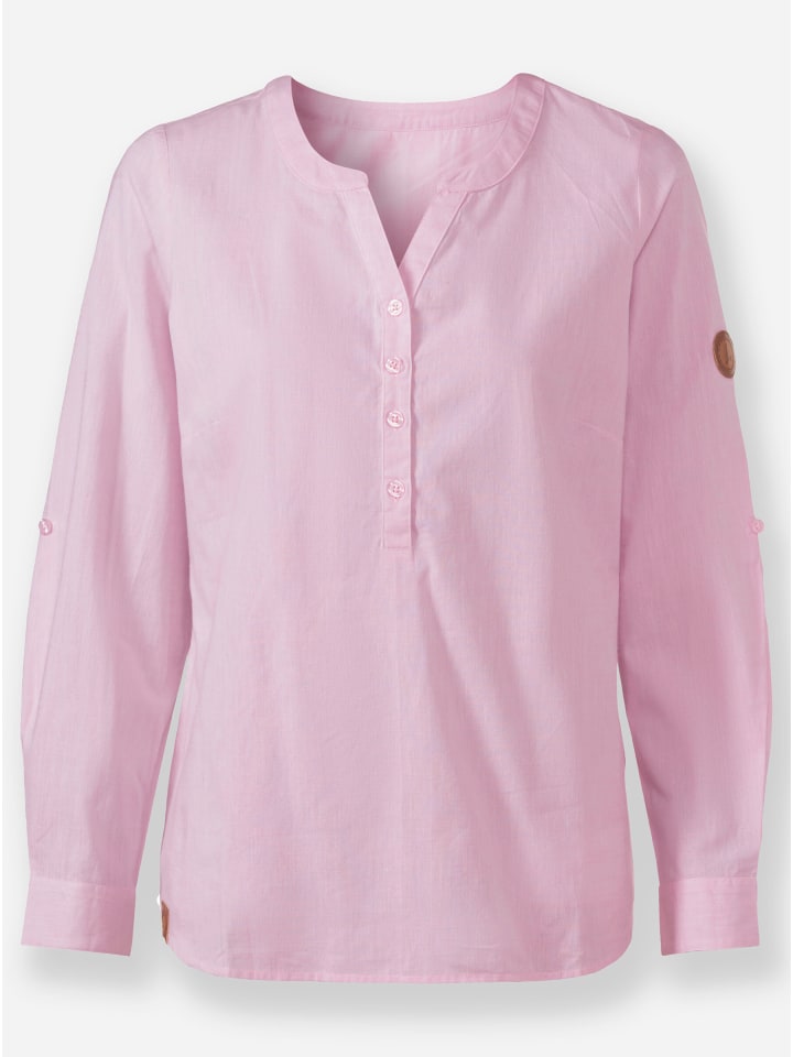 Жизнерадостные цвета обязательно поднимут вам настроение! Эта повседневная блузка без застежек выполнена из легкой текстурированной ткани. Круглый вырез горловины с небольшим V-образным вырезом. Встречная складка на спине обеспечивает удобную посадку. Короткая планка на пуговицах и корректирующие вытачки на груди. Рукава можно подвернуть до длины три четверти и закрепить хлястиком и пуговицой. Низ слегка закруглен. Сертифицировано GOTS.