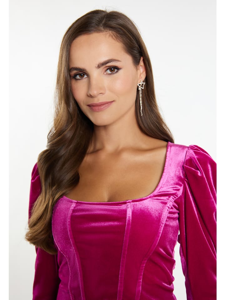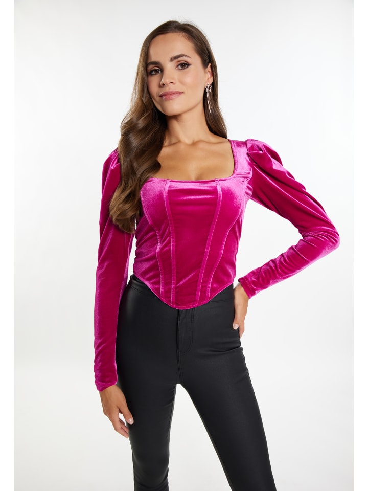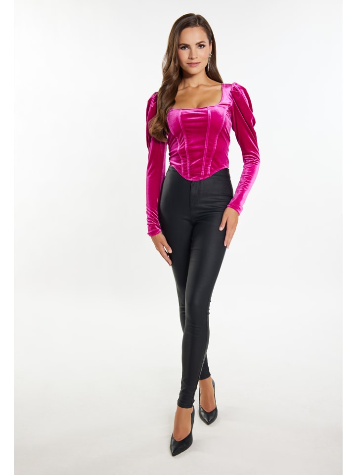 Этот топ от Faina, выполненный в стиле корсета из мягкого эластичного бархата, облегает фигуру. Длинные рукава с буфами на плечах, а квадратный вырез создает глубокое декольте. Закругленный, острый подол эффектно подчеркивает форму корсета.