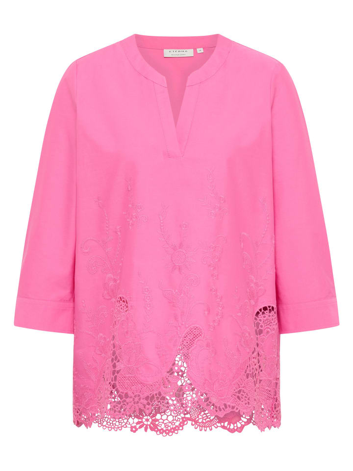Благодаря кружеву подол волнистый, что делает эту свободную блузку настоящей приманкой для глаз. Свободный силуэт характерен для этой свободной блузки. Благодаря современному, свободному крою на талии и бедрах она имеет особенно непринужденный крой. Длина нашей блузки-слипона по спинке составляет 62 см, манжеты застегиваются на пуговицу. Для создания стильного летнего образа с нотками романтики - закажите онлайн прямо сейчас! - Воротник-стойка - Блузка-слип - Повседневный - 100% хлопок - Фактурная ткань - Материал: 100% хлопок