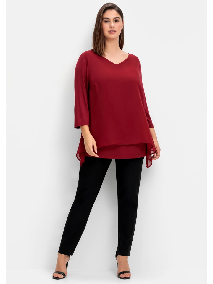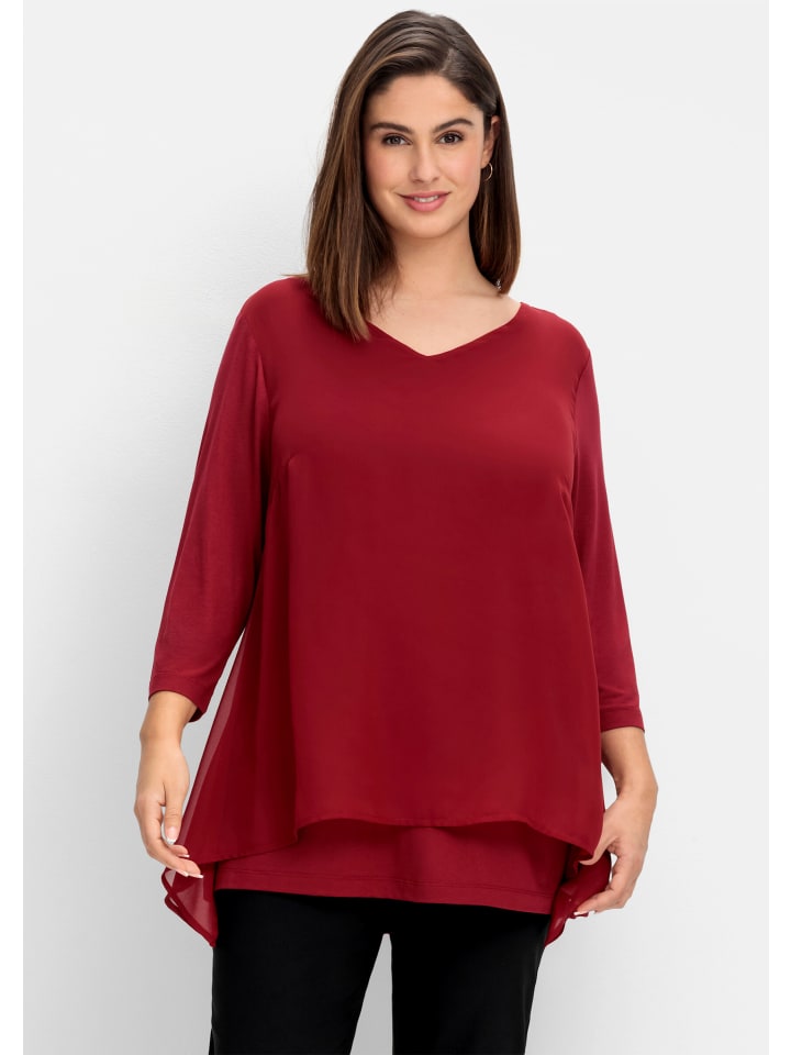 Блузка-рубашка с V-образным вырезом. Двухслойный вид делает этот топ с заостренным подолом таким особенным. В то время как верхний слой выполнен из нежного, слегка прозрачного шифона, нижний слой и удлиненные полурукава поражают своим комфортным качеством эластичного трикотажа. Этот фасон не только идеально дополнит модные деловые наряды - легкость шифона также придает блузке-рубашке элегантный вид и делает ее подходящей для праздничных случаев.