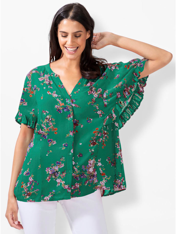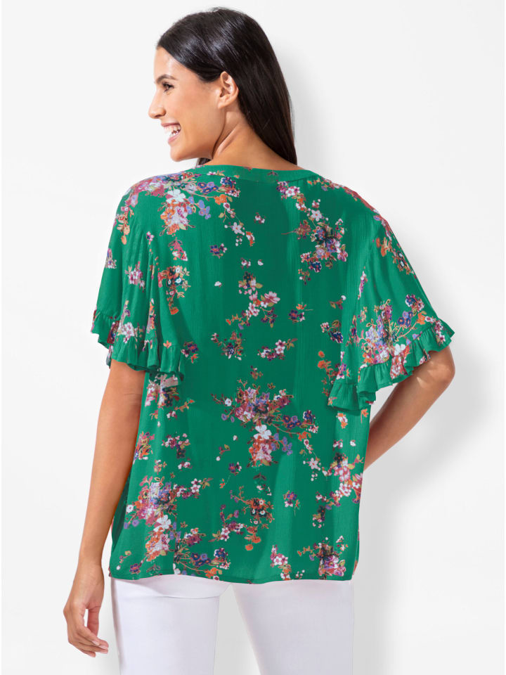 Романтическая цветочная мечта! Блузка с принтом из мягкой струящейся ткани. Свободный крой с круглым вырезом, небольшим V-образным вырезом и застежкой на пуговицы. Рукава-крылышки с рюшами и оборками добавляют женственности.