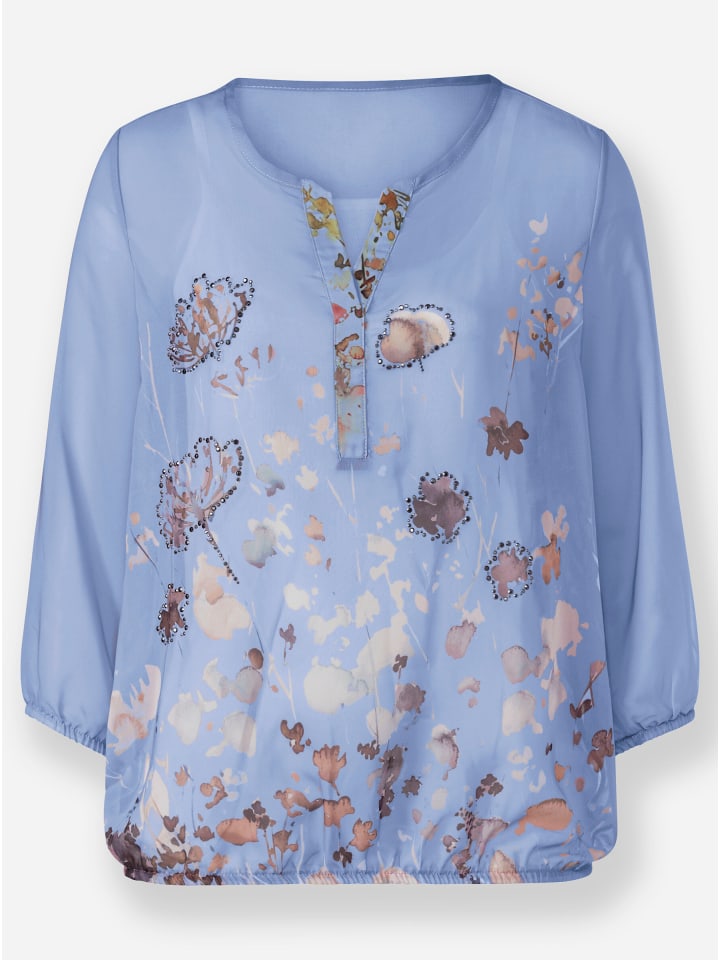 Летняя мечта из нежного шифона! Эта воздушная блузка с красивым цветочным узором спереди украшена мерцающими серебристыми металлическими пайетками. Верх на тонких бретельках делает тело полупрозрачным, а рукава три четверти остаются прозрачными. Круглый вырез с окантовкой и небольшим V-образным вырезом переходит в короткую декоративную планку с пуговицами. Эластичные манжеты и подол обеспечивают удобную и свободную посадку.