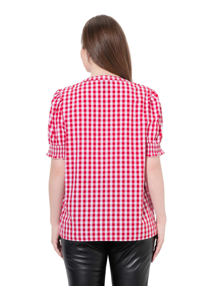 Клетчатая блузка-рубашка в традиционном стиле - с воротником-стойкой, V-образным вырезом и декоративной складкой. Широкие рукава-буфы с манжетами на резинке.