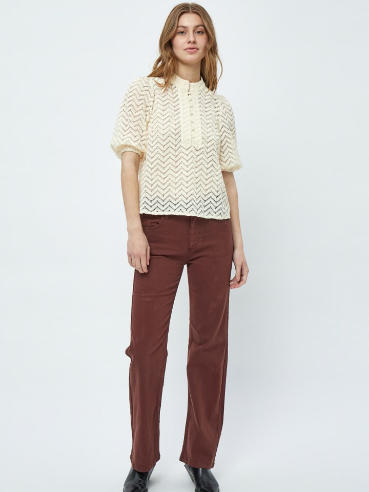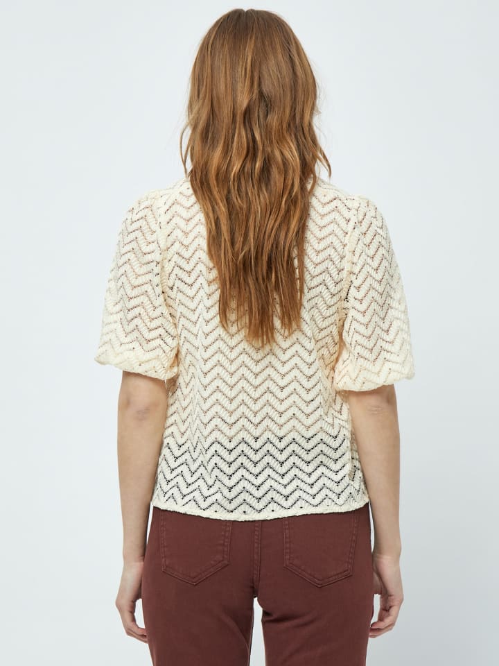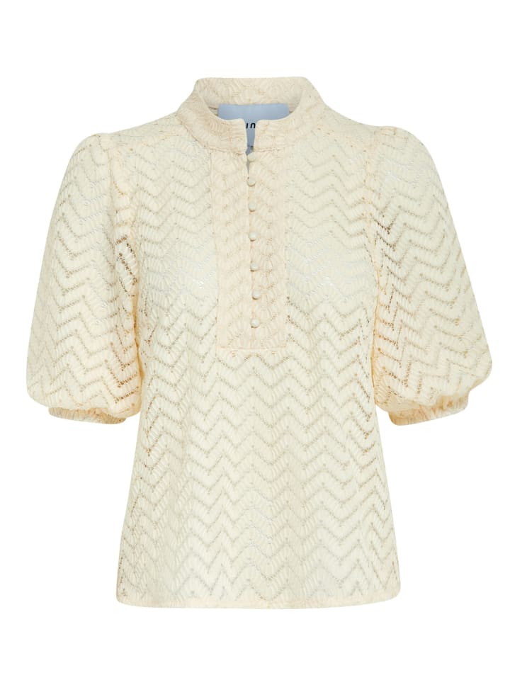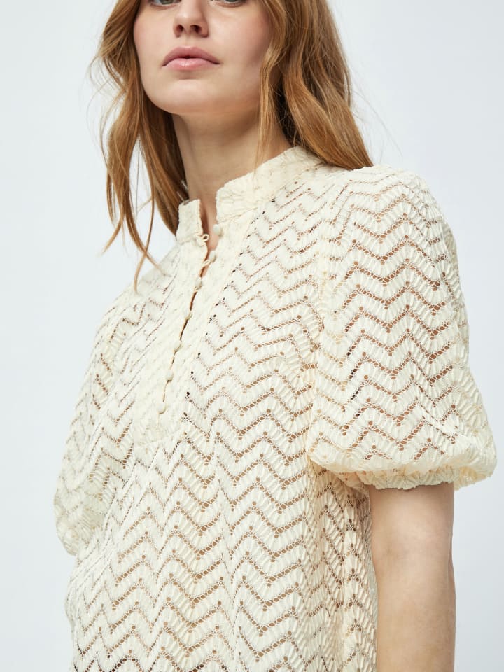 Блузка Jeva выполнена из эластичной ткани, обеспечивающей комфортную посадку и подчеркивающей фигуру. Она имеет V-образный вырез, который полностью застегивается на маленькие пуговицы. Блузка также имеет короткие рукава-фонарики и интересный рисунок на ткани.