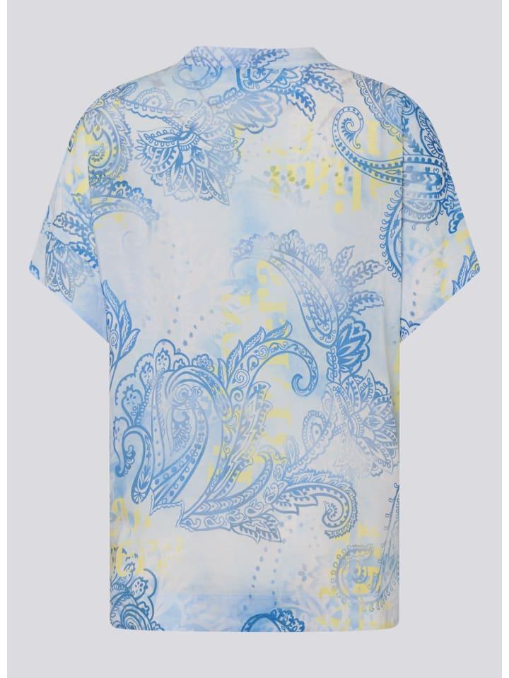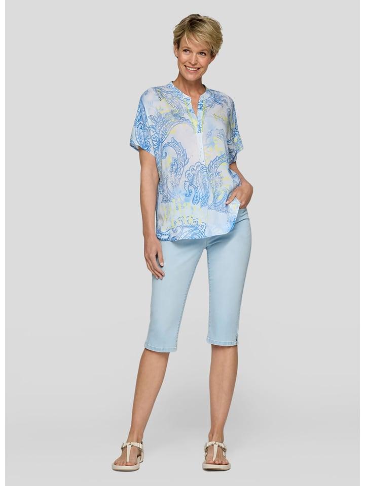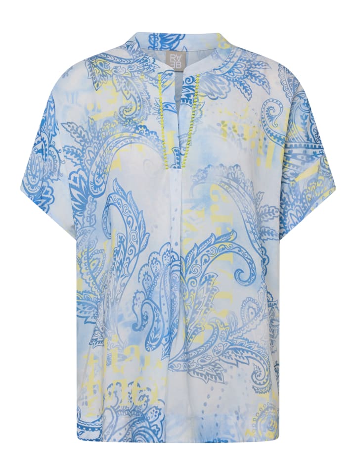 Эта блузка впечатляет своим художественным узором пейсли и воздушным, женственным видом. Небольшой воротник-стойка с V-образным вырезом и изящной декоративной строчкой добавляет стильные детали, а свободный крой гарантирует комфортную носку. Нежный узор пейсли в гармоничных тонах. Воротник-стойка с V-образным вырезом для современного образа. Изящная декоративная строчка как изысканная деталь на вырезе. Легкий, воздушный материал - идеально подходит для теплых дней. Прямой крой для удобного и стильного образа.