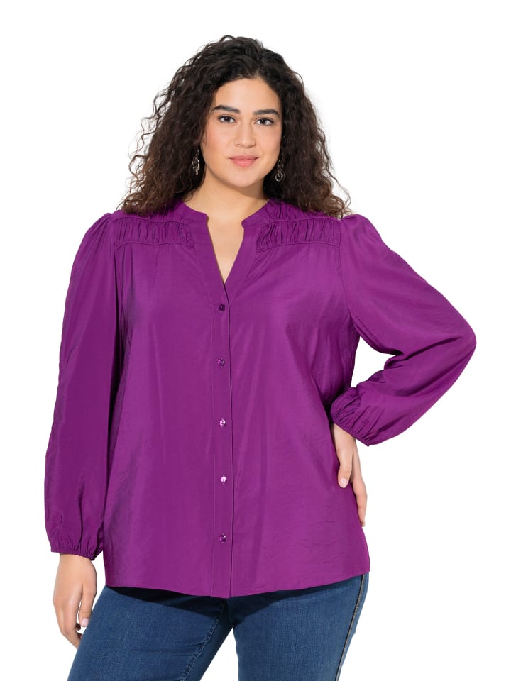 Блузка А-силуэта из мягкой смесовой вискозы с декоративной кокеткой на плече. Вырез горловины туника, планка на пуговицах, длинные рукава с эластичными манжетами.
